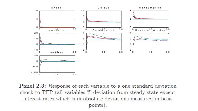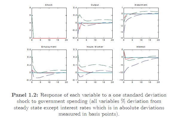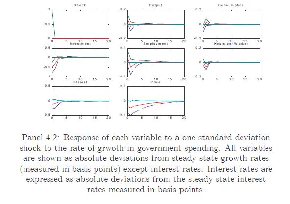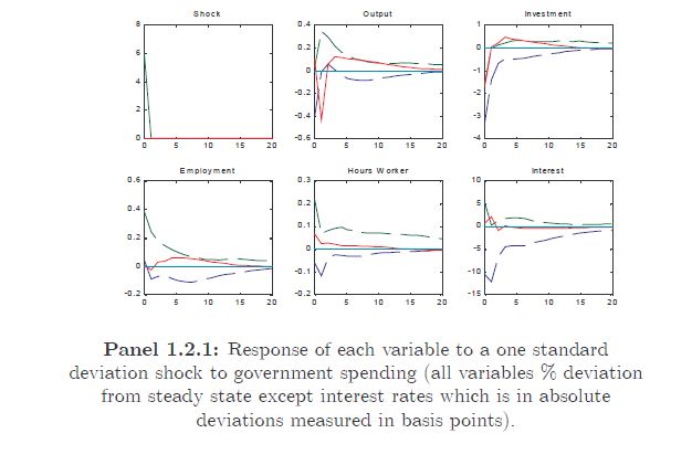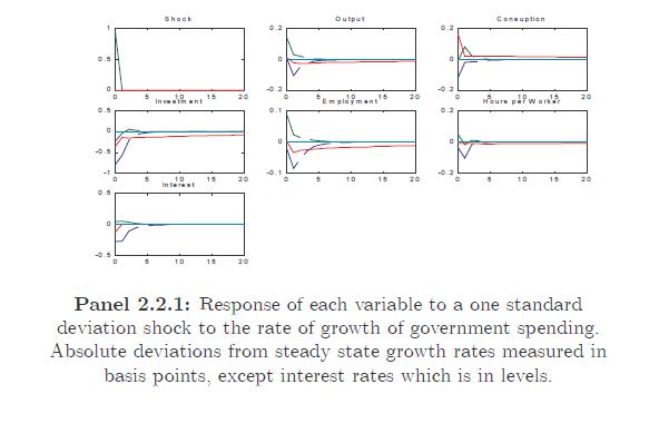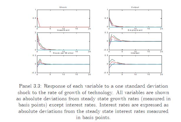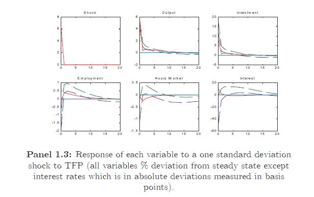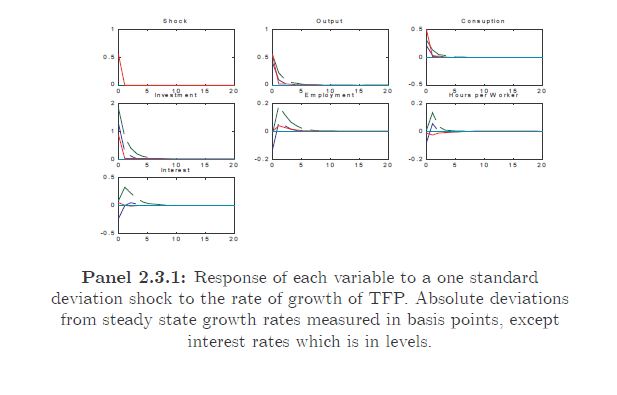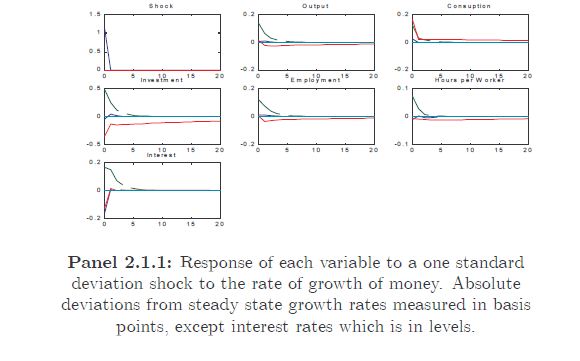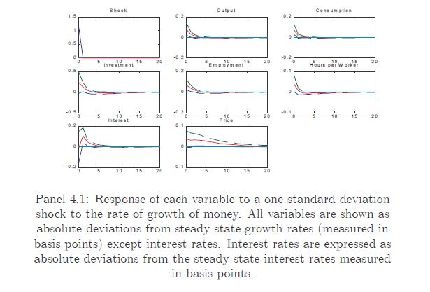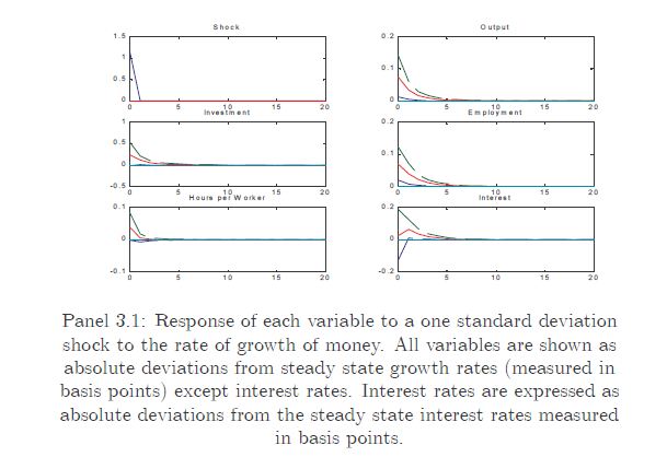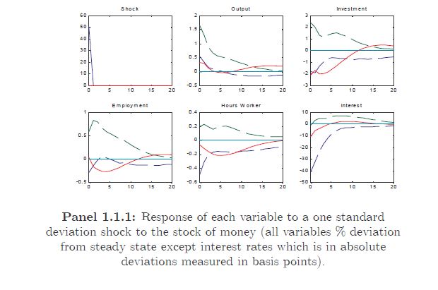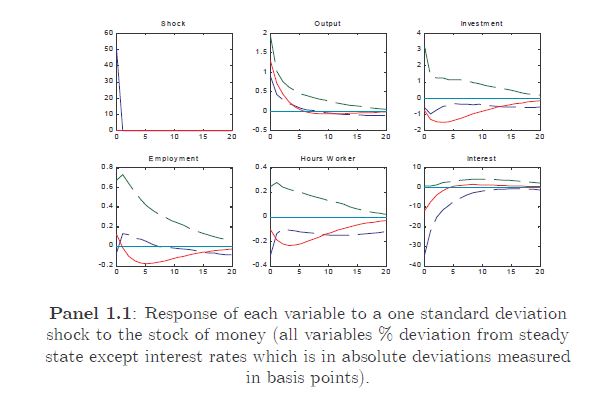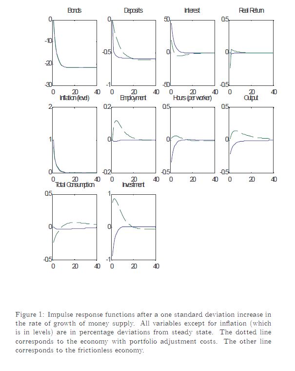 This paper studies the dynamic response of a few key macroeconomic variables to each one of three exogenous shocks: monetary, government spending and technological shocks. By using a cash in advance model with two market frictions, one in the intermediati