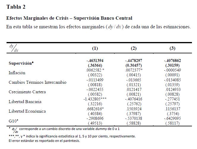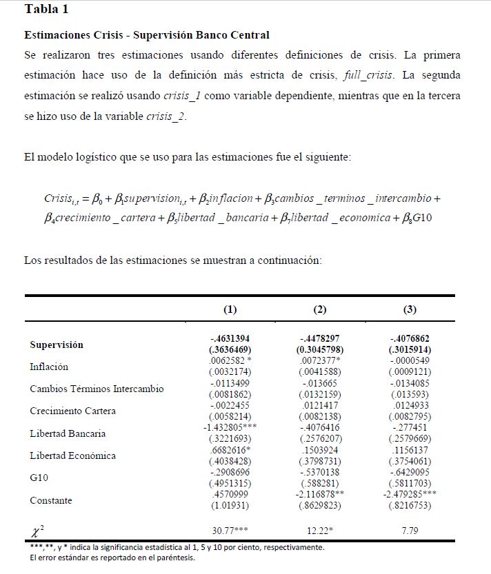 En este artículo se realiza una revisión de los modelos de supervisión frecuentemente usados y las características que estos deben cumplir para alcanzar niveles óptimos de supervisión. Adicionalmente, se revisan las ventajas que surgen al involucrar al banco central en el proceso de supervisión. Se realiza un ejercicio empírico para distintos países para los años comprendidos entre 1980 y 1997 y se encuentra que la probabilidad de crisis aumenta ante la presencia de altas tasas de inflación y se reduce en presencia de 05res niveles de libertad bancaria. Adicionalmente, los ejercicios muestran que el poder de supervisión mejora cuando el banco central cumple un rol como supervisor.