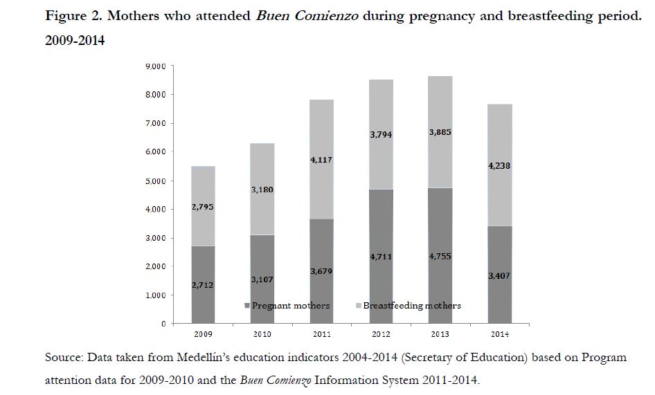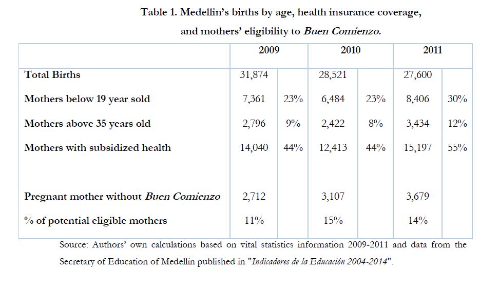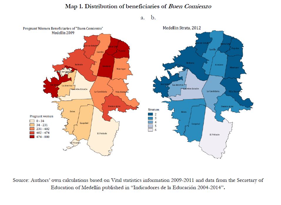Este documento examina los efectos de una estrategia dirigida a madres gestantes en condiciones de vulnerabilidad sobre los indicadores de sus hijos al nacer. Para lo anterior se usa información administrativa del programa Buen Comienzo, una iniciativa lanzada por el gobierno local de Medellín, la segunda ciudad más grande de Colombia. Con el fin de identificar el efecto, se obtienen estimadores de emparejamiento o matching usando datos de madres participantes del programa así como del censo de estadísticas vitales. Se encuentra que el programa aumentó el peso al nacer de hijos de madres participantes en 0.09 y 0.23 desviaciones estándar para niños y niñas respectivamente, reduciendo la incidencia de bajo peso al nacer en 2.6 y 4.6 pp respectivamente. En cuanto a la talla al nacer, el programa Buen Comienzo habría reducido la probabilidad de tener baja talla en 3 y 4 pp para niños y niñas en cada caso. En términos de nacimientos prematuros, los resultados muestran una reducción en su probabilidad de entre 3 y 8 pp. Finalmente, se encuentra evidencia de efectos diferenciales del programa dependiendo del tiempo de exposición y frecuencia de asistencia a la estrategia. En términos de costo-beneficio nuestros estimados sugieren que los beneficios del programa podrían estar entre 2 y 6 veces sus costos en el caso de niños y niñas nacidos de madres participantes con exposición temprana al programa.