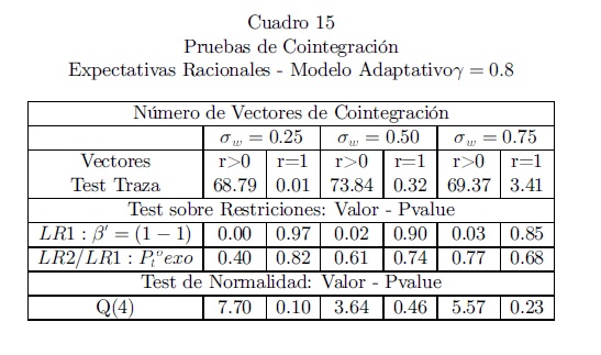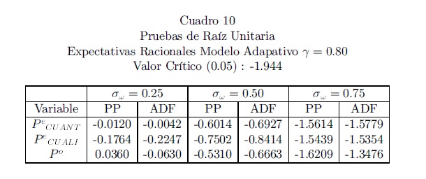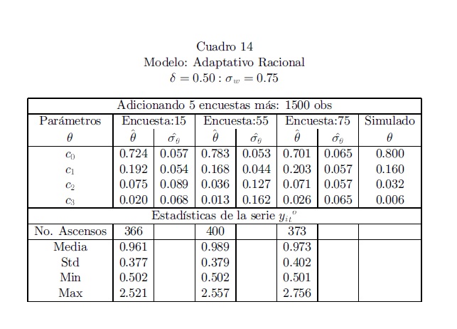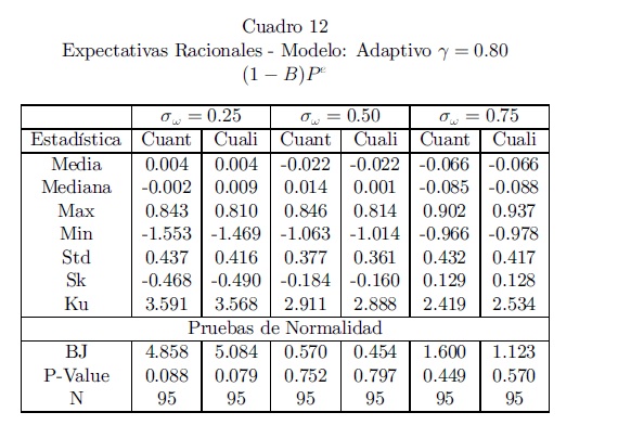 En este documento se presentan los resultados de la estimación de medidas de expectativas, así como, el desempeño de modelos probabilísticos utilizados para describir las preferencias de individuos, a partir de encuestas de carácter cualitativo, empleadas frecuentemente en la investigación de expectativas. Los ejercicios que se presentan en este documento tienen como base la extracción de la respuesta cualitativa de expectativas. La estimación de los parámetros y de las medidas de expectativas se hace a través de: Modelos Multinomiales Logísticos (MML), Modelos de Fricción, (MF), conteos derivados a partir de la respuesta cualitativa implícita en la encuesta cuantitativa y el nivel observado de la variable de referencia. El desempeño de los modelos permite concluir que a partir de la respuesta cualitativa es factible: (i) derivar estimativos similares a los que se obtendrían si se hiciese una encuesta cuantitiva, sin estar sujeto a los "indeseables efectos de valores extremos", totalmente en el caso de MML y parcialmente en el caso de MF; (ii) usar y evaluar diferentes mecanismos de formación de expectativas, desde el proceso de formación mismo y (iii) obtener medidas de concenso de la opinión de los encuestados. Los ejercicios presentados en este documento dependen significativamente del ato grado de homogeniedad, respecto del conjunto de información, que tienen los agentes que contestan la encuesta.
