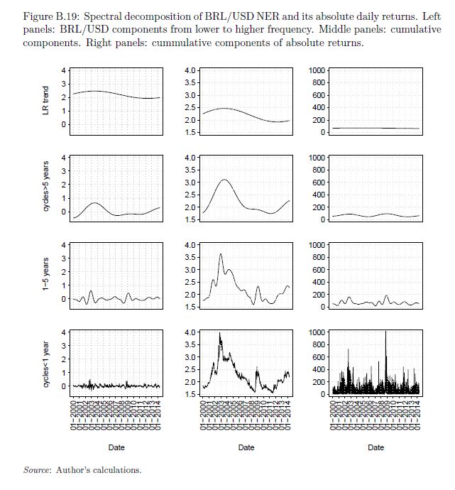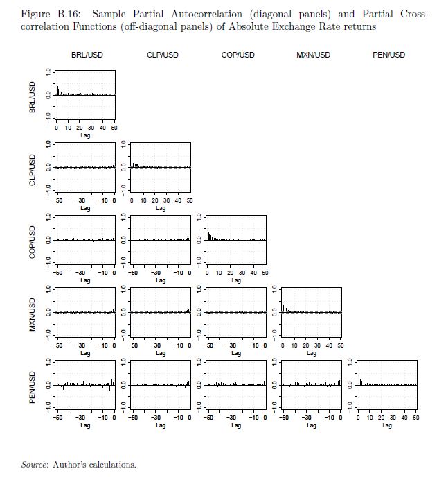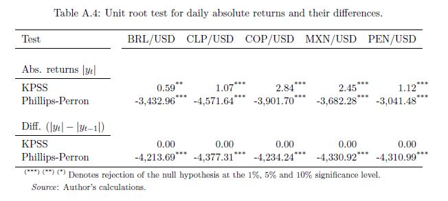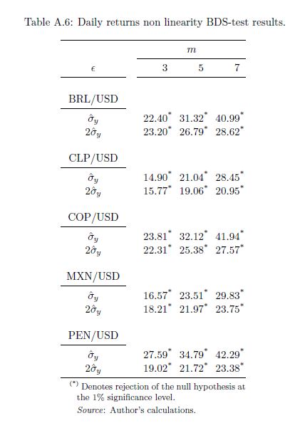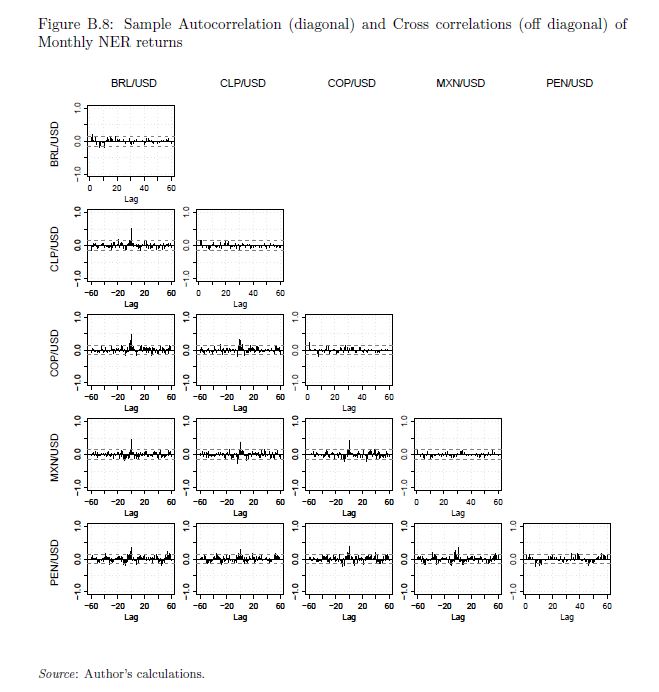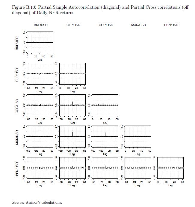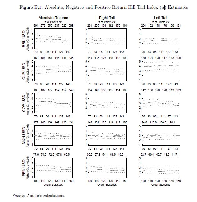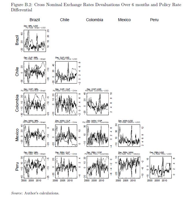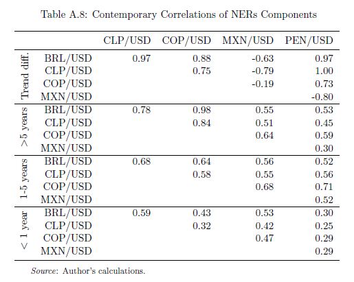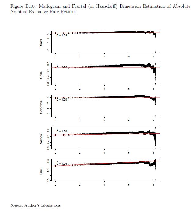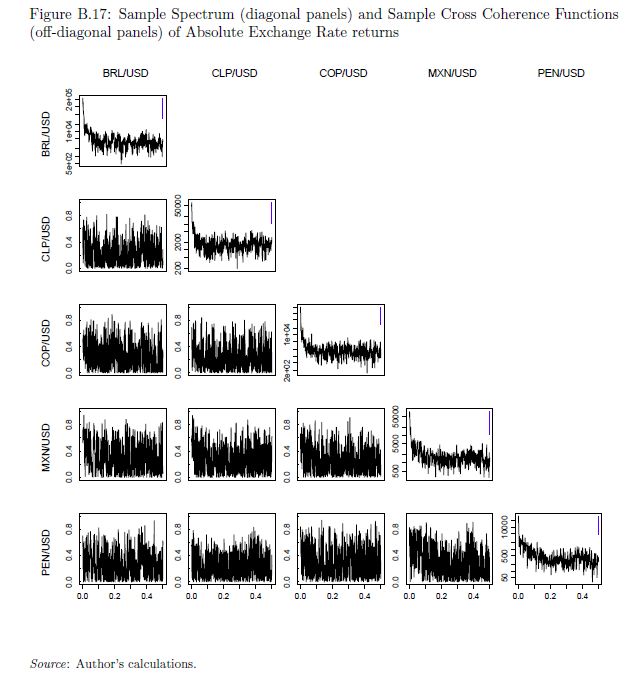 A la luz de literatura reciente en este escrito se interpretan los hechos estilizados más comunes de las tasas de cambio nominales en Chile, Colombia, M exico y Perú con respecto al D olar Norteamericano, y se explora un conjunto no muy conocido de estos hechos. Entre muchos otros hallazgos se encontr o que: (i) las colas de la distribuci on de los retornos ordinarios y absolutos obedecen leyes de potencia inversa, \inverse power laws", un conjunto de regularidades empíricas que ocurren con frecuencia y que parecen surgir de violaciones a los supuestos del Teorema del L mite Central y que se puede interpretar a trav z del \principio de universalidad"; (ii) la suave tendencia sinusoidal de muy largo plazo y el ruido de corto plazo de estas tasas est an dominados por un componente c clico no sim etrico con cambios repentinos de direcci on en Brazil, Chile y Colombia, pero lo opuesto ocurre en los dos pa ses restantes; y (iii) la correlaci on entre los componentes en el dominio del tiempo de distintos pa ses sugiere la existencia de factores comunes que esplican estas tasas y que pueden estar relacionados con "carry trade" y riesgos tiempo dependientes relacionados con el apetito por riesgo de los inversionistas internacionales.