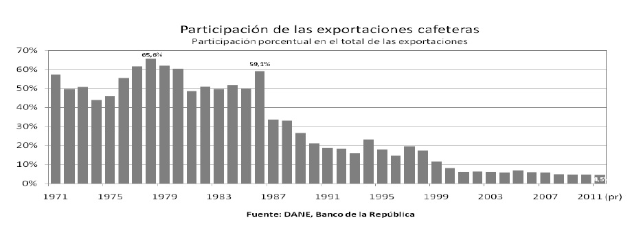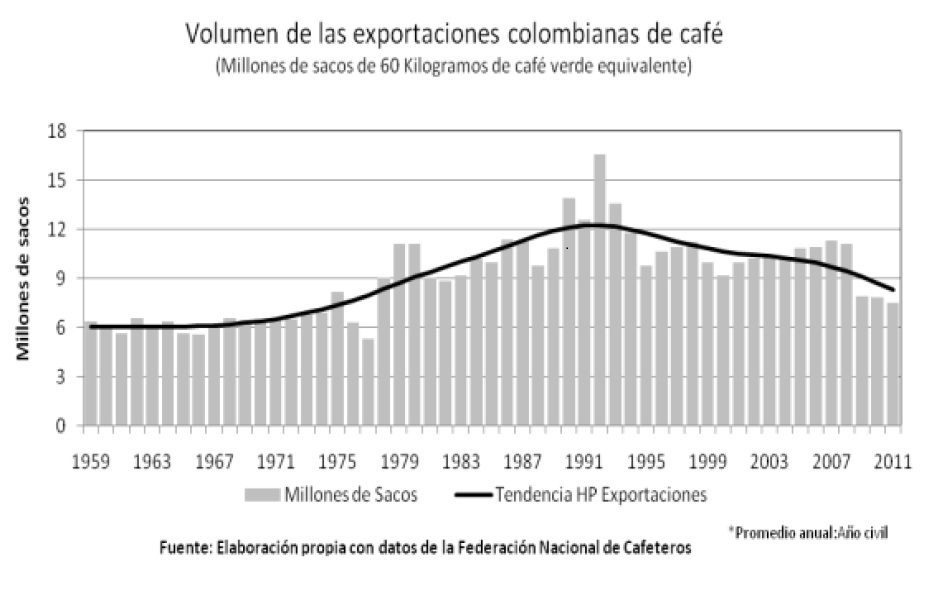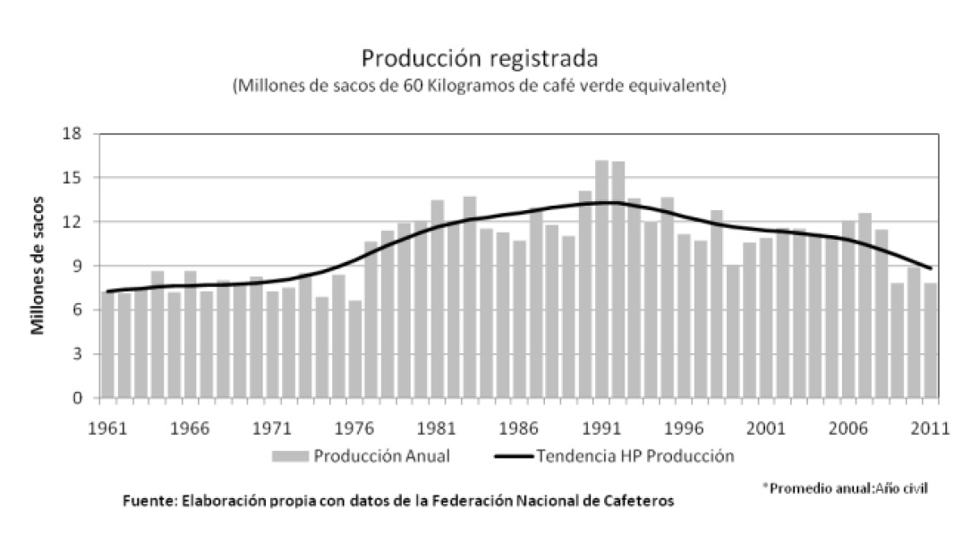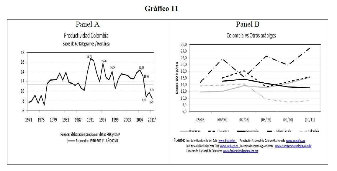La pérdida de importancia económica de la caficultura en Colombia, tanto en el contexto nacional como en el internacional, se explica, principalmente, por la caída dramática de su productividad; el consiguiente empobrecimiento de los caficultores, así como por el envejecimiento de estos y de los cafetos; la lentitud de los procesos de adopción de nuevas tecnologías y variedades resistentes a las plagas, en especial la roya; y la baja fertilización, entre otros factores. Ejercicios econométricos sugieren que la actividad cafetera, vía consumo, impacta más el crecimiento económico que la industria minera, con la ventaja adicional de que la caficultura emplea grandes porciones de la población y dinamiza la malla productiva de las regiones, siendo un instrumento ideal para sacar a grandes poblaciones rurales de la pobreza. También, se señala que la institucionalidad colombiana ha desaprovechado el actual esquema de libre comercio del grano para recuperar la productividad y las exportaciones. Finalmente, se elaboran recomendaciones, en relación con el cultivo, la comercialización y las instituciones del sector, para fortalecer su capacidad de enfrentar futuros choques de precios y contribuir a atenuar sus efectos sobre la economía.