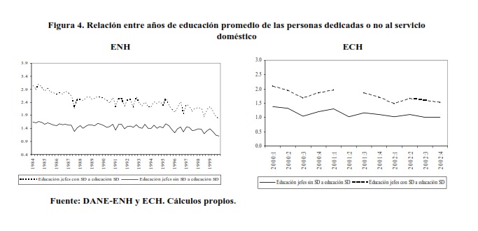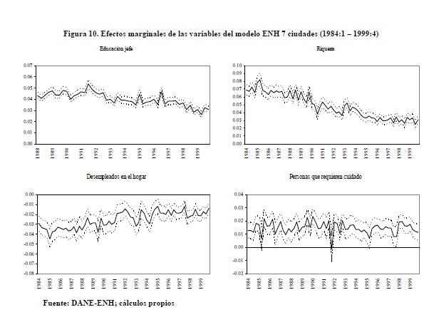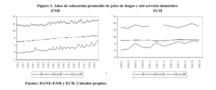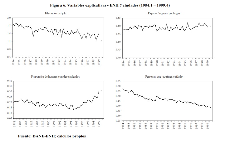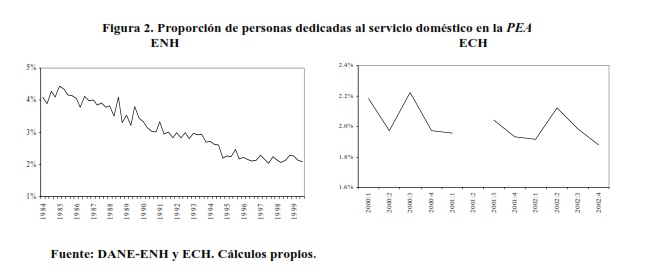 Entre 1984 y 2002 se presentó una caída permanente en la proporción de hogares colombianos que utilizan personal asalariado para trabajo doméstico ("servicio doméstico"). Para estudiar este hecho utilizamos un modelo teórico de la decisión del hogar de tener o no tener servicio doméstico, y realizamos una estimación econométrica de tal probabilidad. Dicha probabilidad se ve afectada no sólo por las decisiones de demanda de los hogares sino también por las de oferta de las personas dedicadas a este oficio. Las variables explicativas del modelo son el nivel educativo del jefe del hogar en relación con el del servicio doméstico, el número de desempleados en el hogar, la riqueza del mismo y el número de personas que requieren cuidado (personas incapacitadas e inválidas, personas en la primera infancia y 05res de 80 años). Todas las variables son significativas a lo largo del período de estudio 1984-2002 y tienen el signo esperado. En materia de pronóstico el modelo se desempeña bien. La fuente de la información es el conjunto de todas las etapas de la Encuesta Nacional de Hogares y de la Encuesta Continua de Hogares para las siete 05res ciudades.