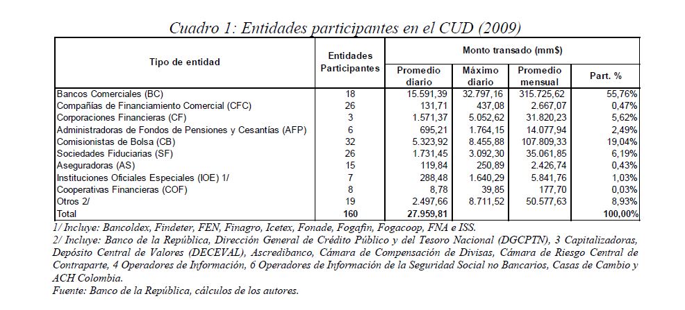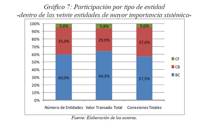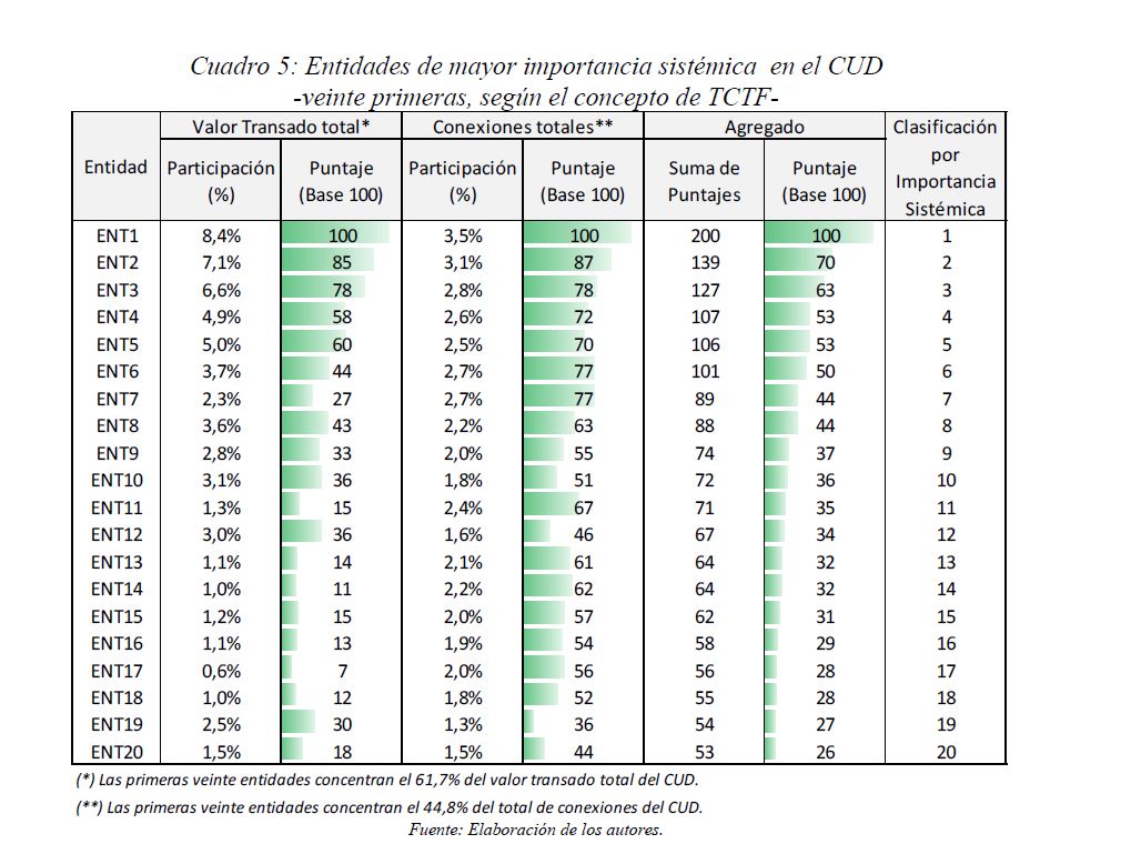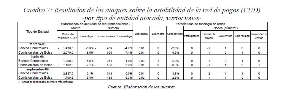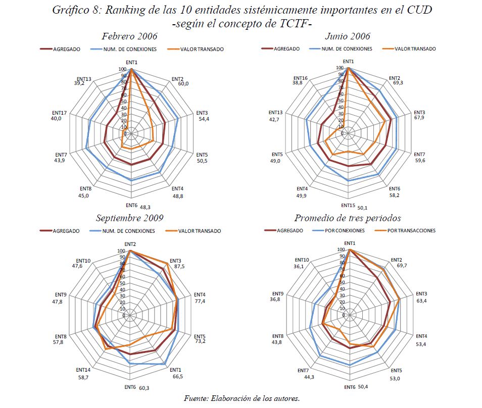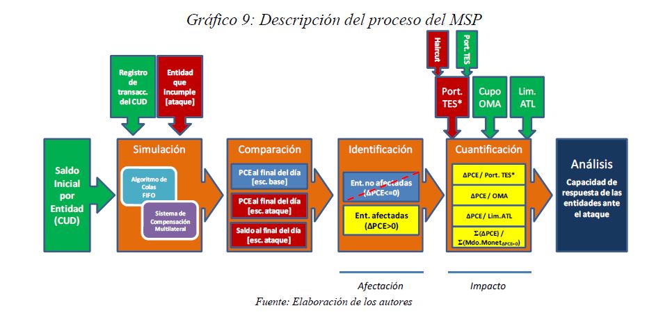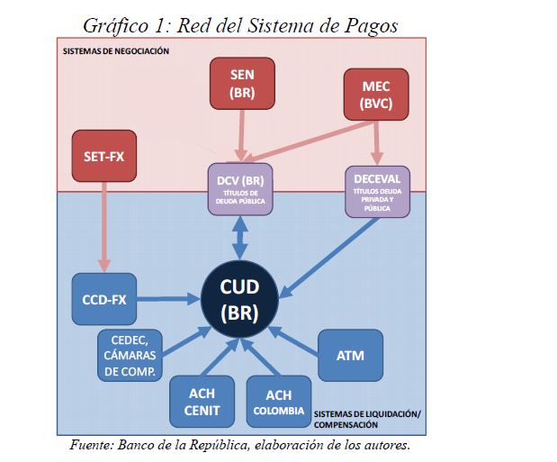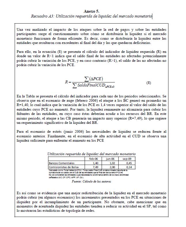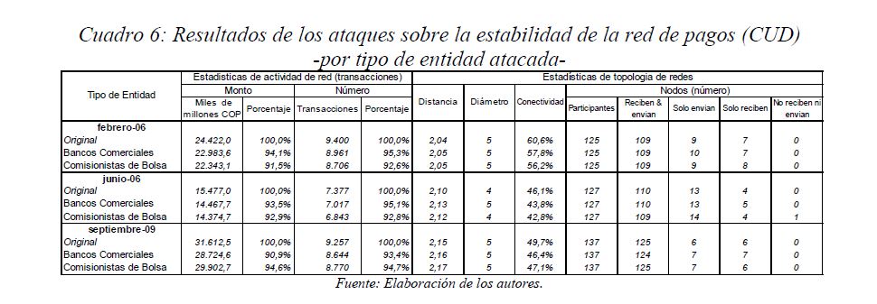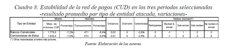Este documento estudia la estabilidad del sistema de pagos (SP) de alto valor en Colombia (CUD) ante el incumplimiento de una entidad sistémicamente importante, y evalúa la capacidad de respuesta de las entidades afectadas a partir de la utilización de sus recursos y a través de los mecanismos de liquidez que brinda el Banco de la República. De acuerdo con la literatura reciente, las entidades sistémicamente importantes se identifican bajo el concepto de too-connected-to-fail (TCTF) para diferentes escenarios de volatilidad del mercado de TES y de actividad del SP. La estabilidad del SP se evalúa mediante Topología de Redes (TR) y un Modelo de Simulación de Pagos (MSP), el cual incorpora un algoritmo de resolución de colas recursivo tipo FIFO (First In First Out) y un algoritmo de compensación multilateral. Los resultados de la TR sugieren que el CUD es una red de tamaño mediano, robusta, estable y concentrada. El MSP mostró, además, que variables como los saldos de las entidades en el CUD, la oportunidad de las transacciones intradía, y la concentración de liquidez, inciden sobre el número de entidades afectadas. Se encontró que la 05ría de las entidades cuenta con mecanismos que les permiten solventar la iliquidez temporal en el SP. Sin embargo, existen entidades que, por su estructura y especialidad de su negocio, deben hacer un 05r esfuerzo en la administración del riesgo de liquidez.