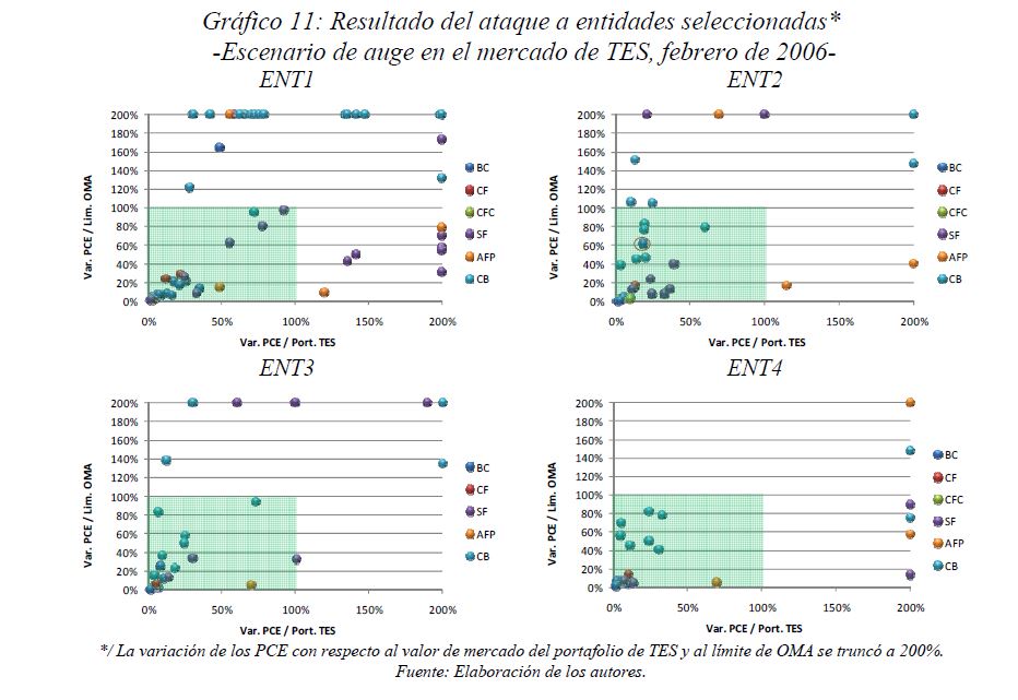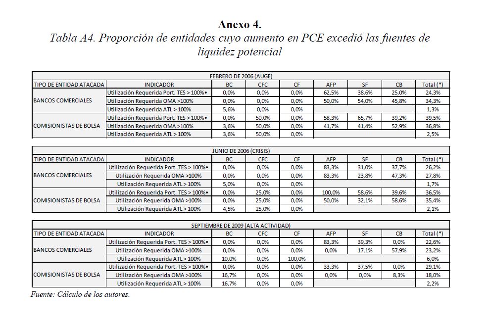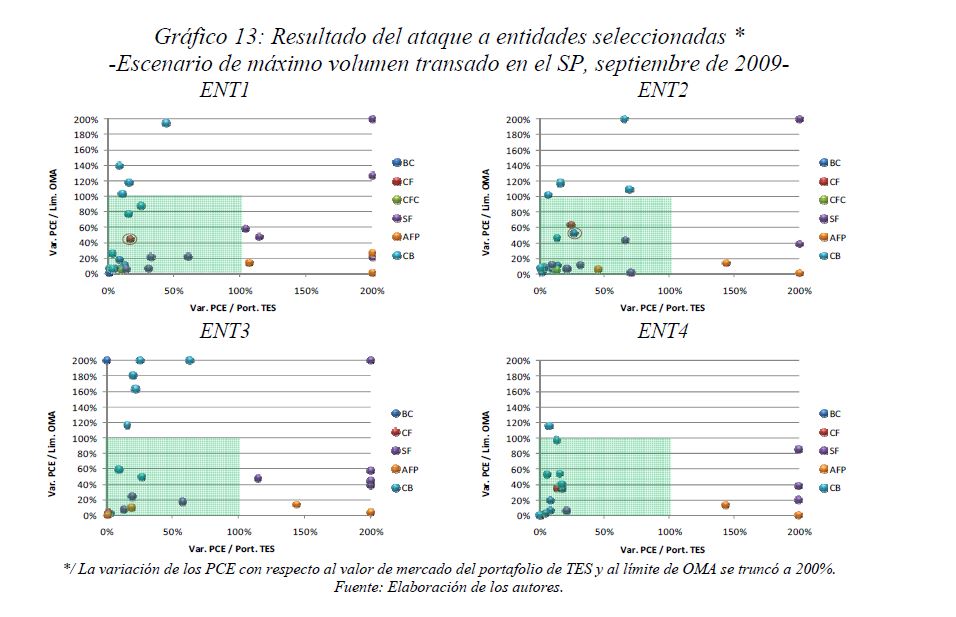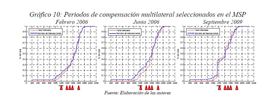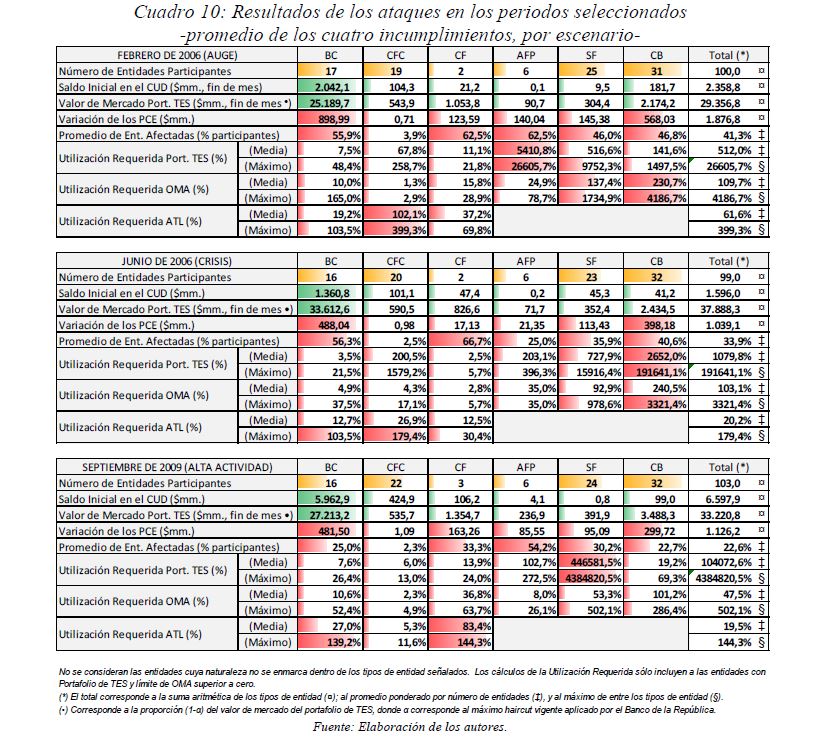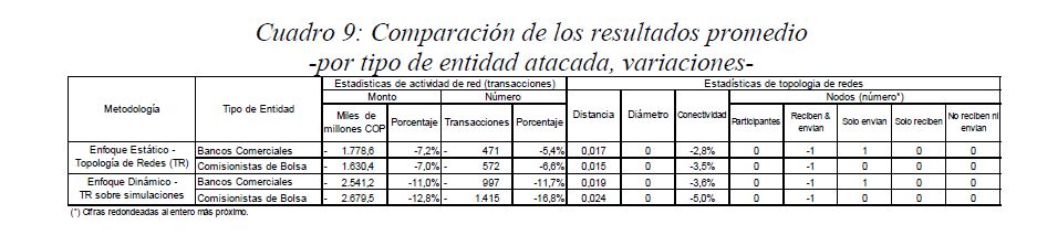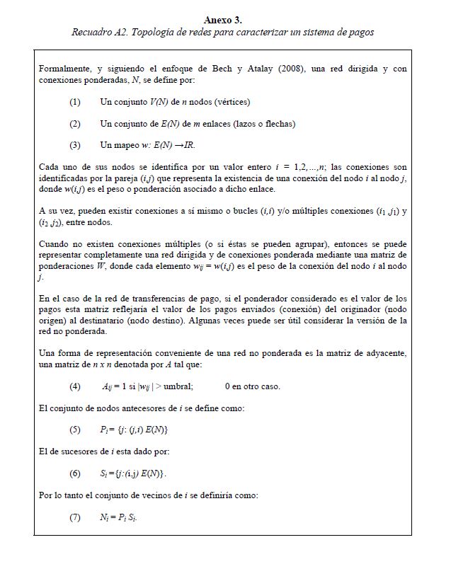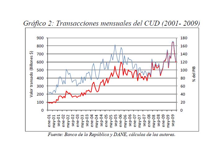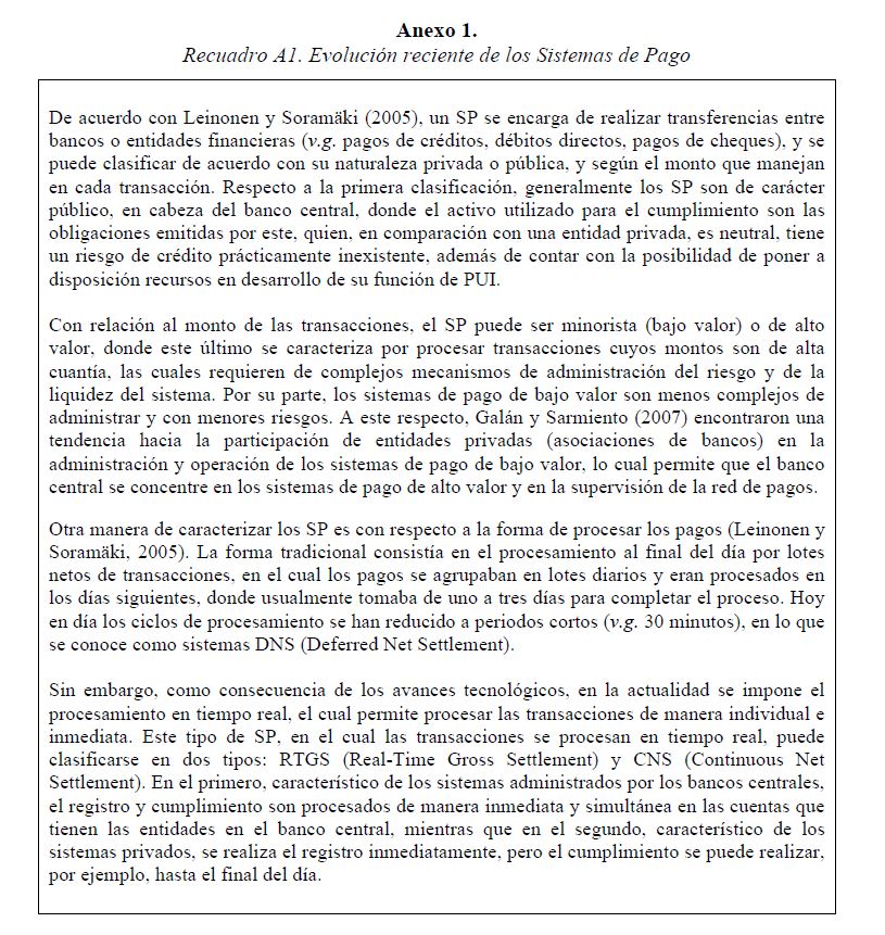Este documento estudia la estabilidad del sistema de pagos (SP) de alto valor en Colombia (CUD) ante el incumplimiento de una entidad sistémicamente importante, y evalúa la capacidad de respuesta de las entidades afectadas a partir de la utilización de sus recursos y a través de los mecanismos de liquidez que brinda el Banco de la República. De acuerdo con la literatura reciente, las entidades sistémicamente importantes se identifican bajo el concepto de too-connected-to-fail (TCTF) para diferentes escenarios de volatilidad del mercado de TES y de actividad del SP. La estabilidad del SP se evalúa mediante Topología de Redes (TR) y un Modelo de Simulación de Pagos (MSP), el cual incorpora un algoritmo de resolución de colas recursivo tipo FIFO (First In First Out) y un algoritmo de compensación multilateral. Los resultados de la TR sugieren que el CUD es una red de tamaño mediano, robusta, estable y concentrada. El MSP mostró, además, que variables como los saldos de las entidades en el CUD, la oportunidad de las transacciones intradía, y la concentración de liquidez, inciden sobre el número de entidades afectadas. Se encontró que la 05ría de las entidades cuenta con mecanismos que les permiten solventar la iliquidez temporal en el SP. Sin embargo, existen entidades que, por su estructura y especialidad de su negocio, deben hacer un 05r esfuerzo en la administración del riesgo de liquidez.