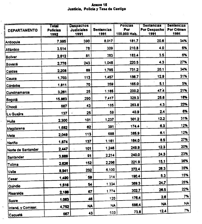 Colombia tiene una tasa de criminalidad excepcionalmente alta. Esta información se sostiene al menos para los últimos 20 años y se puede comprobar con las cifras sobre asesinatos en Colombia y en otros países. Mientras que en Colombia la tasa de homicidios fue de 77.5 por cada 100.000 habitantes en el período 1987-1992, en países como Brasil fue 24.6, Bahamas 22.7, México 20.6, Nicaragua 16.7, Venezuela 16.4, Argentina 12.4, Sri Lanka 12.2, Perú 11.5, Ecuador 11 y estados Unidos 8, en un período casi similar (1986-1989) (1), y para mencionar sólo a los más violentos. Más aún, a lo largo del pasado decenio se agravó notablemente el fenómeno en Colombia. Así, el número de homicidios pasó de 36 por cada 100.000 habitantes en 1981 a 48 en 1985 y a 80 en 1990 (2). La alta tasa de homicidios en Colombia no puede asociarse a una situación de guerra civil ni de violencia política, Aunque en Colombia ha subsistido por más de 40 años una actividad guerrillera, el número anual promedio de muertos en acciones militares pertenecientes a las fuerzas armadas regulares o a las guerrilleras en una proporción casi insignificante del número total de homicidios de los últimos decenios (menos del 1% en 1993). Más aún, l as actividades de la guerrilla ligadas al narcotráfico y al secuestro de civiles con fines económicos hacen cada vez más borrosa la línea divisoria entre la violencia política y la criminalidad. En Colombia violencia y criminalidad son casi sinónimas en su historia contemporánea y sobretodo en los últimos años. La explicación de los factores que inciden sobre la criminalidad en Colombia tiene, por tanto, gran importancia en la actualidad. En efecto, de un diagnóstico correcto de los problemas de inseguridad y criminalidad pueden resultar las políticas correctivas, tan necesarias en un ambiente de impunidad y pesimismo.A fin de comprender menor la hipótesis y los resultados de este trabajo es conveniente recapitular, en forma breve, los temas y las ideas dominantes al res