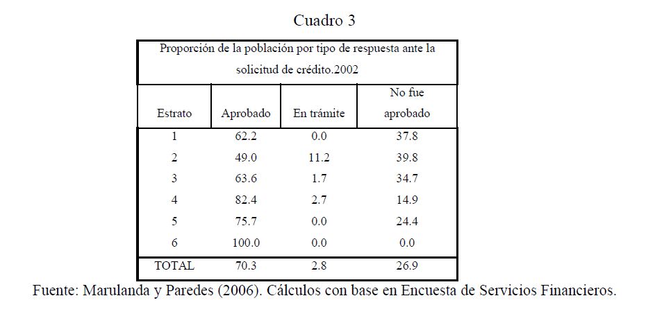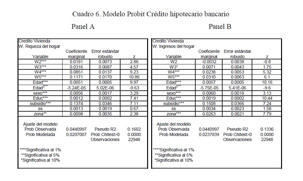 This paper identifies the main determinants of credit access for Colombian households. It finds that income, wealth, geographical position, access to social security, the education level and age affect the probability of credit use (mortgage loans and cre