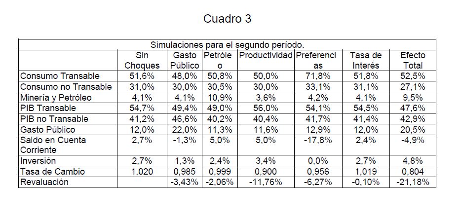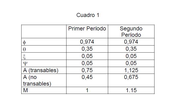 Un hecho estilizado de la economía colombiana es el significativo proceso de apreciación del tipo de cambio real en lo que va corrido de la década de los noventa. Tomando un índice del tipo de cambio real definido como la relación entre el precio de los bienes transables y el precio de los bienes no transables se evidencia que el tipo de cambio colombiano se apreció 23.45% en términos reales durante el período 1990-1996. Con respecto al ITCR, definido por el Banco de la República, el proceso de apreciación real entre principios de 1990 y el final de 1996 fue de aproximadamente 17%. Este trabajo busca ofrecer una explicación al proceso de apreciación real a partir de los factores fundamentales del tipo de cambio. Para tal propósito se plantea, en primera instancia, un modelo de equilibrio general intertemporal. Posteriormente el modelo es calibrado para los años 1990/1991. Por último, el modelo se somete a diferentes choques observados en la economía colombiana durante el período 1990 - 1996. El modelo teórico es bastante sencillo: La economía es pequeña y abierta con tres sectores productivos (uno transable, uno no transable y un sector petrolero de tipo enclave). El horizonte temporal es de tres períodos que buscan reflejar la situación antes de 1990, el período 1990-1996 y la situación después de 1996, en su respectivo orden. En cada período interactúan consumidores racionales, firmas optimizadoras y un gobierno. Los factores productivos son capital y trabajo. El trabajo es perfectamente móvil intersectorialmente y su oferta es inelástica e idéntica en cada período.Con respecto al capital, éste es demandado por los sectores transable y no transable. Se observa que tanto el monto como la composición (transable vs no transable) de la inversión depende del comportamiento optimizador de la firma. Tampoco hay dinero. El resultado básico del modelos es que la mayor parte de la apreciación del tipo de cambio real colombiano obedece a choques en sus fundamentos reales y no al régimen monetario o cambiario implementado por el Banco de la República. Los choques que pudiéramos llamar "responsables" del proceso de apreciación real son el incremento en la participación del gasto público en el PIB, los flujos de capital con contrapartida en un incremento del gasto privado, la bonanza petrolera por Cusiana y la ampliación de la brecha tecnológica entre el sector transable y el no transable. En esencia, se plantea la hipótesis de que el fenómeno de apreciación es simplemente el resultado de un desplazamiento hacia abajo en la trayectoria de largo plazo o de equilibrio en el tipo de cambio real. Si la apreciación en el tipo de cambio real en la economía colombiana se explica totalmente por factores reales, se puede concluir que el régimen de tipo de cambio nominal, si algo, ha hecho que el ajuste del tipo de cambio real sea más lento y tenga consecuencias inflacionarias. Del mismo modo, se concluye que la caída en la participación del sector transable dentro del PIB y el déficit comercial son respuestas de equilibrio de los agentes ante cambios en los fundamentos reales de la economía. El valor agregado del presente trabajo radica en la incorporación de la acumulación de capital, transable y no transable, a un modelo de economía pequeña y abierta. Por tanto, permite desagregar con mayor precisión los efectos que el gasto privado tiene sobre los precios relativos de la economía. Por otro lado, deja ver el efecto de ''crowding-out'' que el gasto público tiene sobre la inversión y el consumo privado. Adicionalmente, permite cuantificar el efecto de los cambios en productividades sobre la evolución de la inversión.