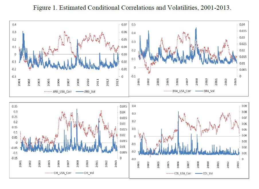 This study uses a Dynamic Conditional Correlation multivariate GARCH approach for testing for contagion among Latin American financial markets to shocks originated in the United States and Europe. Using daily data on stock market returns for the period co