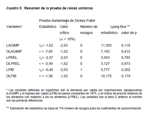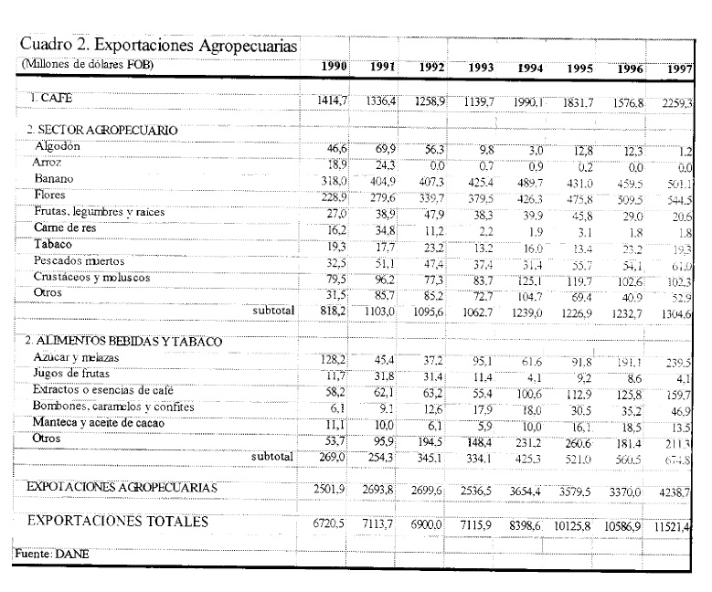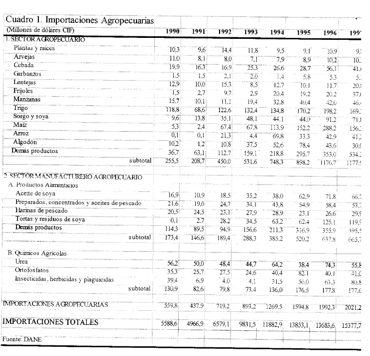 Durante la década de los noventa las importaciones agropecuarias en Colombia se han incrementado considerablemente contribuyendo al déficit de la cuenta corriente, lo cual ha causado preocupación. Este incremento de las importaciones agropecuarias se ha atribuido a la apertura económica, al mismo tiempo que se le señala como la razón más importante detrás del comportamiento mediocre del sector agropecuario. No son pocos los que han sugerido echar atrás el proceso de liberación del comercio exterior, y aunque tal cambio de política es poco probable debido a los compromisos internacionales adquiridos, es evidente que dicho proceso se ha desacelerado en los últimos tres años. Este estudio examina algunos efectos del proceso de apertura internacional en el sector agropecuario, evaluando las relaciones entre las importaciones agropecuarias y variables macroeconómicas como la tasa real de cambio y el ingreso, al tiempo que verifica la hipótesis de un cambio estructural en la demanda de importaciones agropecuarias como resultado de la apertura del comercio internacional en 1991. Para lograr este objetivo se desarrolla un modelo econométrico y se evalúan las relaciones de largo plazo entre las variables por medio de cointegración. Los resultados indican que el incremento de las importaciones agropecuarias se explica principalmente por la revaluación de la tasa real de cambio y el aumento del ingreso per capita de los consumidores, en tanto que las políticas de apertura han contribuido al desplazamiento de la demanda por importaciones agropecuarias aunque en una magnitud menor a la que comúnmente se le ha atribuido.