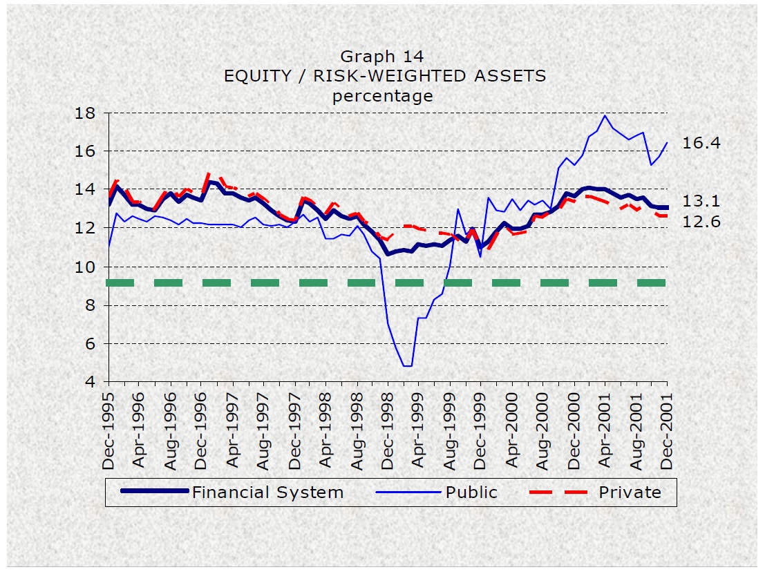 Colombia’s financial system has experienced important transformations during the last two decades. In order to illustrate the most significant modifications, Tables 1 and 2 present a summary of the financial system’s structure during four different points in time: 1986- 1989, 1990, 1995, and 2001. Table 1 shows the assets of different types of banks (private domestic banks, foreign banks and state-owned banks), Savings and Loans corporations, and the rest of the financial system, all of them as a proportion of GDP. Table 2 complements the information by presenting the participation of each financial intermediary in the total assets of the financial system.