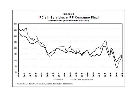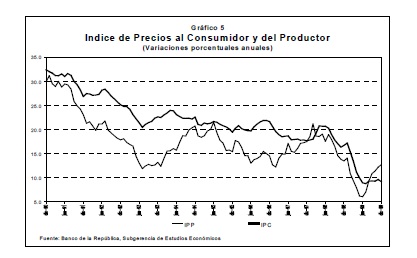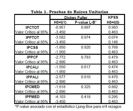En este documento se da un breve resumen teórico de índices de precios, como también se describe las diferencias en la composición del IPC e IPP colombianos. Mediante técnicas econométricas se establecieron relaciones de largo plazo entre componentes de los dos indicadores, y se realizaron pruebas de causalidad, con el fin de indagar tanto la magnitud como el sentido de la relación. Los resultados obtenidos muestran que no hay evidencia de una relación directa entre IPC total e IPP total, sin embargo, al excluir los componentes no comunes (servicios en IPC y consumo intermedio en IPP) la evolución de los dos indicadores es muy similar, y la causalidad en el sentido de Granger se da en ambos sentidos. A un nivel más desagregado (alimentos y medicamentos) también se encontraron vínculos entre los indicadores.