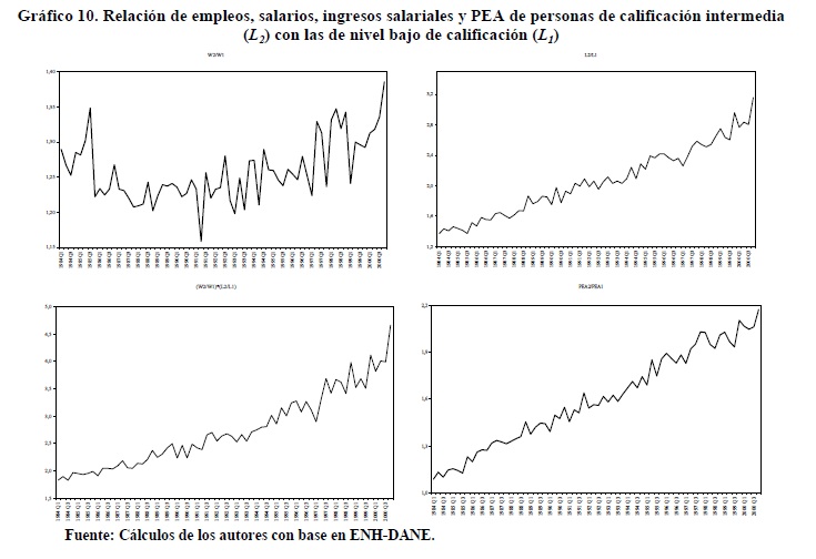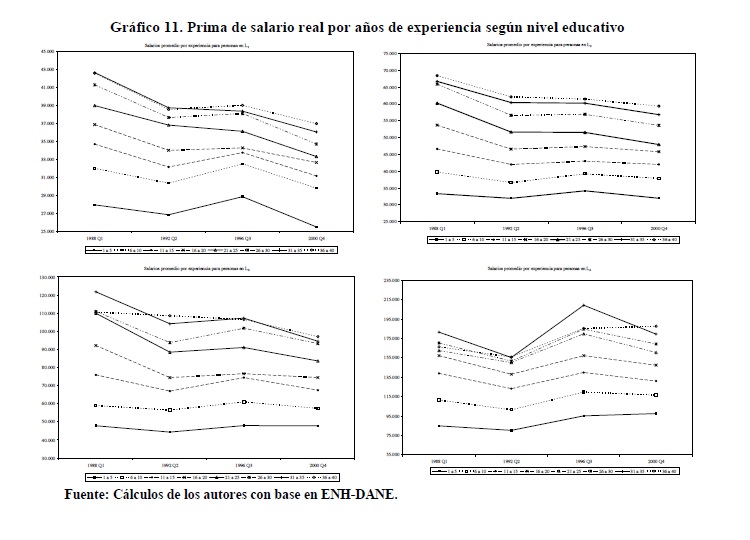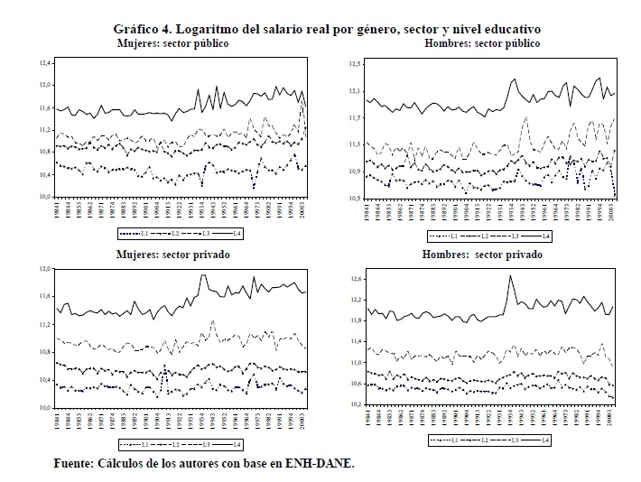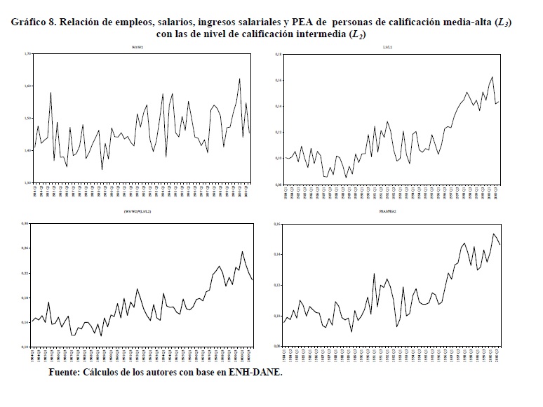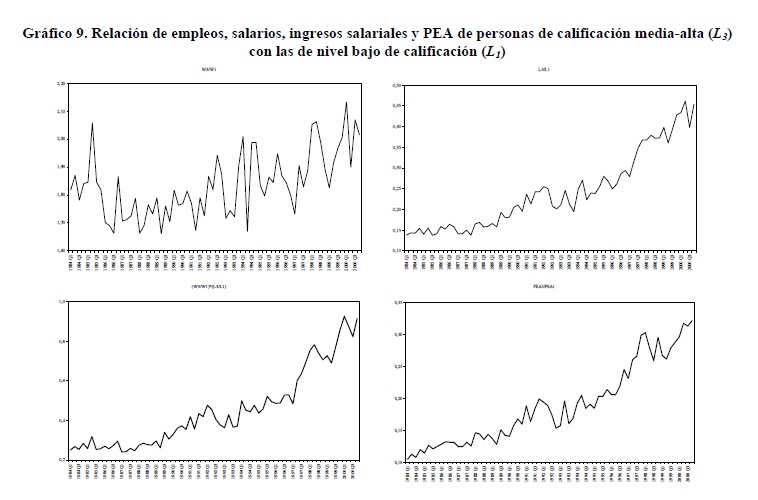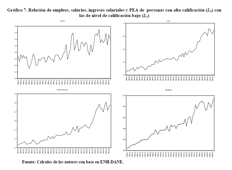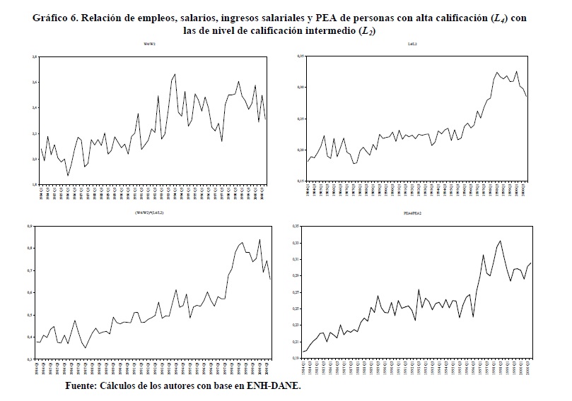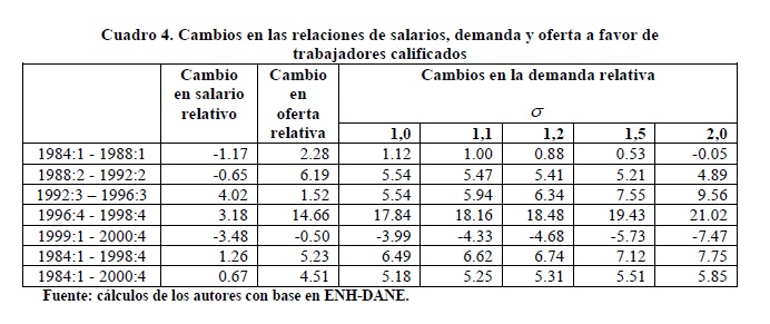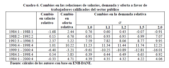 Entre 1984 y 2000 se registraron variaciones importantes en la relación entre salarios de los trabajadores de 05r y menor nivel educativo. Entre 1992 y 1998 se presentó un incremento de esta relación que muy probablemente contribuyó a explicar la reversión de la tendencia previa a la desconcentración del ingreso ocurrida durante los años 90, mientras que lo contrario se observó en los períodos 1984-91 y 1999-2000. Nuestras estimaciones indican que tales variaciones de los salarios fueron causadas por movimientos de la relación entre demanda y oferta laboral, en consonancia con el modelo convencional de determinación de salarios. Además, no se rechaza la hipótesis de ocurrencia de un cambio técnico, al menos en un sentido laxo, intensivo en el uso de trabajadores del 05r nivel educativo durante los años 90 cuyo efecto en la demanda fue tan alto que no logró ser compensado por los aumentos en la oferta.