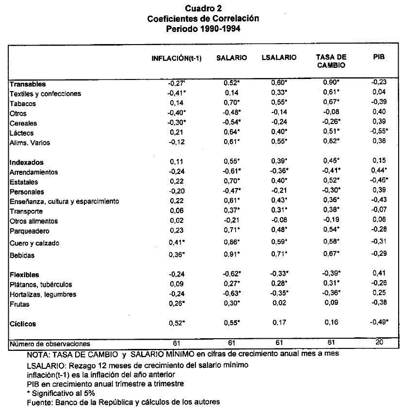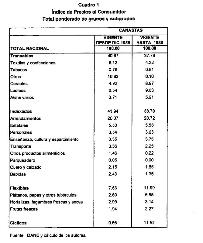 La ausencia de una clasificación apropiada ha conducido a innumerables desagregaciones del IPC, las cuales responden en buena parte a las preferencias de cada autor. Dentro de las desagregaciones más frecuentes, se encuentra aquella que separa a los alimentos de los no-alimentos. Los proponentes de esta desagregación la justifican con base en la particular volatilidad característica de los bienes agrícolas (véase, por ejemplo, Correa y Escobar, 1990; Villar, 1988; Fedesarrollo, 1988). Algunos autores han intentado dividir el IPC en sus componentes transables y no transables, en consonancia con una de las prácticas con mayor aceptación en la literatura internacional(2). Sin embargo, como se espera demostrar en este estudio, para el caso colombiano, esta clasificación no es tan útil, ya que por lo menos uno de estos grupos incluye precios de comportamiento muy heterogéneo.