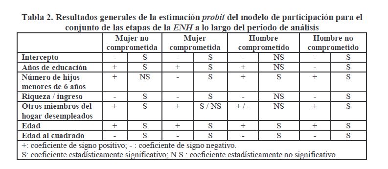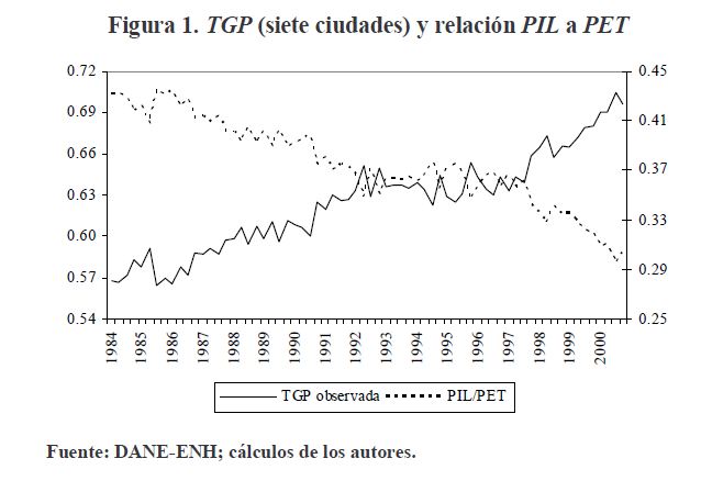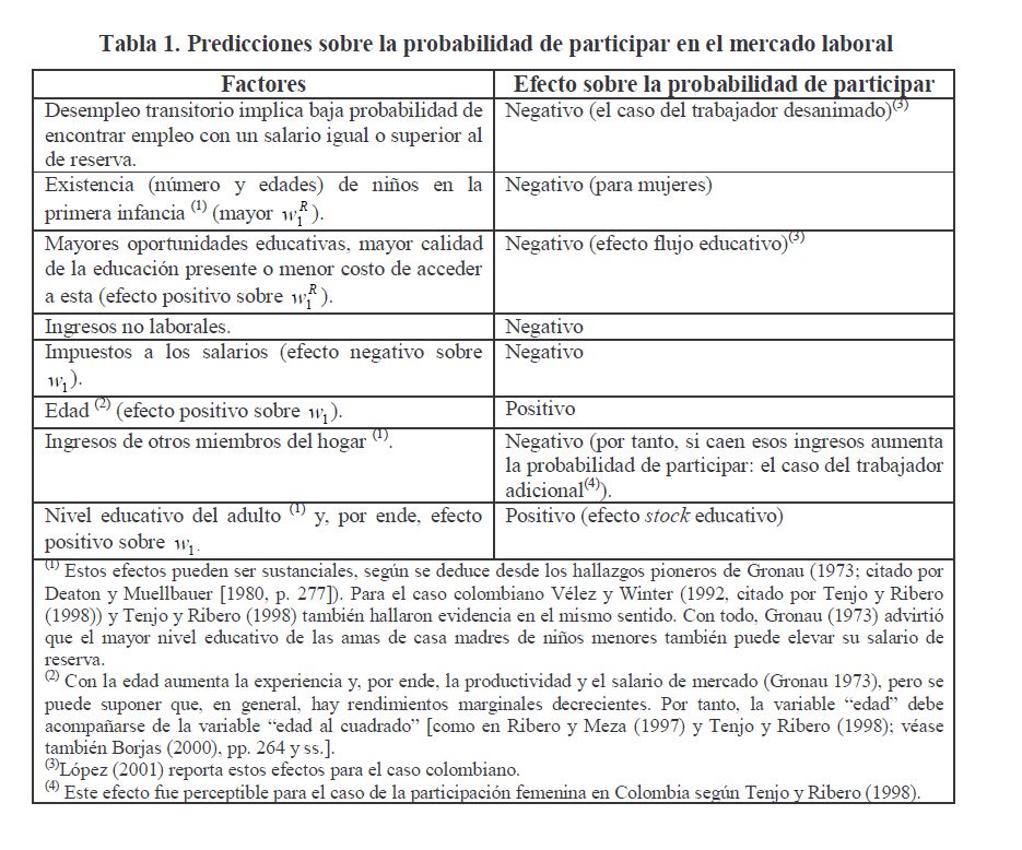 La oferta laboral está determinada por la decisión de participar en el mercado laboral. Este documento reporta los resultados de la estimación econométrica de un modelo de la tasa de participación (siete ciudades) para cuatro categorías de miembros del hogar: mujeres comprometidas (casadas o en unión permanente), mujeres no comprometidas (solteras, viudas o separadas), hombres comprometidos y hombres comprometidos, con base la Encuesta Nacional de Hogares (ENH) del DANE para el período 1984:1-2000:4. Las diferencias entre estos grupos son significativas. Entre los principales determinantes de efecto positivo de la tasa de participación se destacan la tasa de desempleo de otros miembros del hogar, la edad y el nivel educativo alcanzado; el principal determinante de efecto negativo es la riqueza de los hogares. Según el modelo, la tasa de participación cae ante disminuciones en la tasa de desempleo.