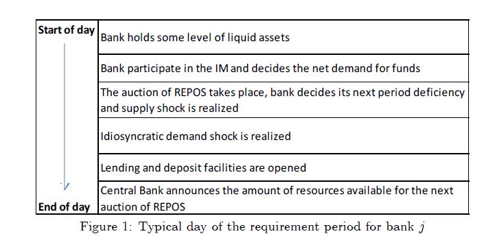 We set a dynamic stochastic model for the interbank daily market for funds in Colombia. The framework features exogenous reserve requirements and requirement period, competitive trading among heterogeneous commercial banks, daily open market operations he