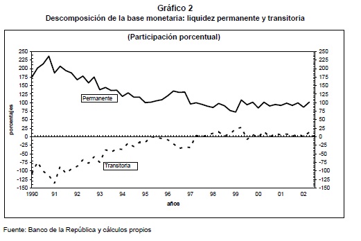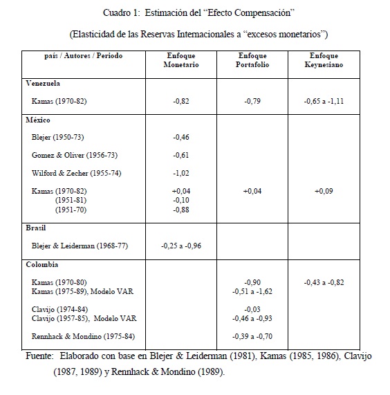 El objetivo de este trabajo es analizar el drenaje de las reservas internacionales debido a los excesos monetarios ( el llamado "efecto compensación"), en el contexto de la 05r flexibilización cambiaria colombiana del periodo 1990 - 2003. En este periodo el costo del arbitraje peso-dólar se ha visto alterado: mientras la flexibilización lo eleva, la desregulación cambiaria lo abarata. Adicionalmente, se evalúa el efecto diferencial que tiene dicho exceso monetario cuando se trata de crédito de tipo permanente respecto del temporal.Nuestras estimaciones econométricas, bajo diferentes enfoques (monetario, función de reacción, portafolio y keynesiano) nos permiten concluir que existe un “efecto compensación” relativamente alto (-0,78) y no muy diferente de menos uno, aun en el corto plazo y en épocas de alta flexibilización cambiaria. También encontramos que este efecto está sustentado en el componente permanente del crédito (salvo en el caso del portafolio) y que probablemente ha sido inferior en cerca de 0,20 respecto al que se producía en los años ochentas, cuando se entregaban como utilidades al gobierno el efecto contable de la devaluación.