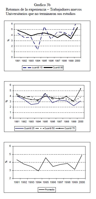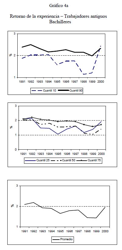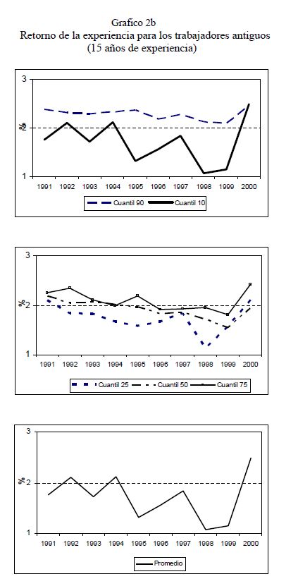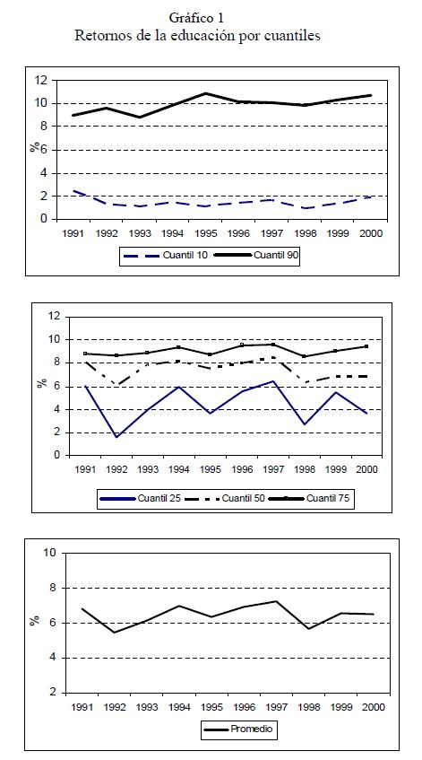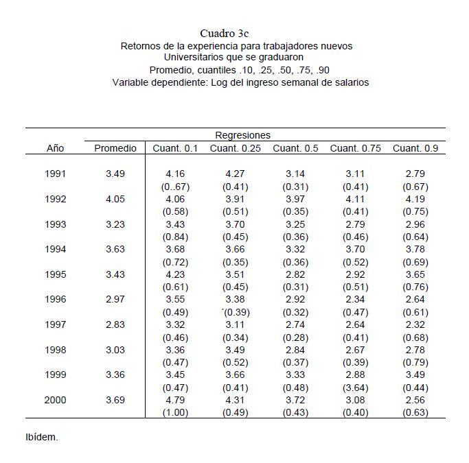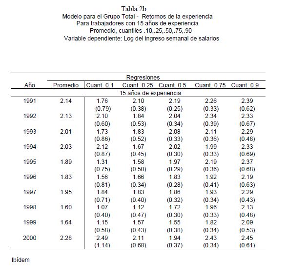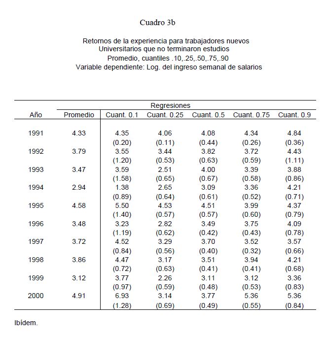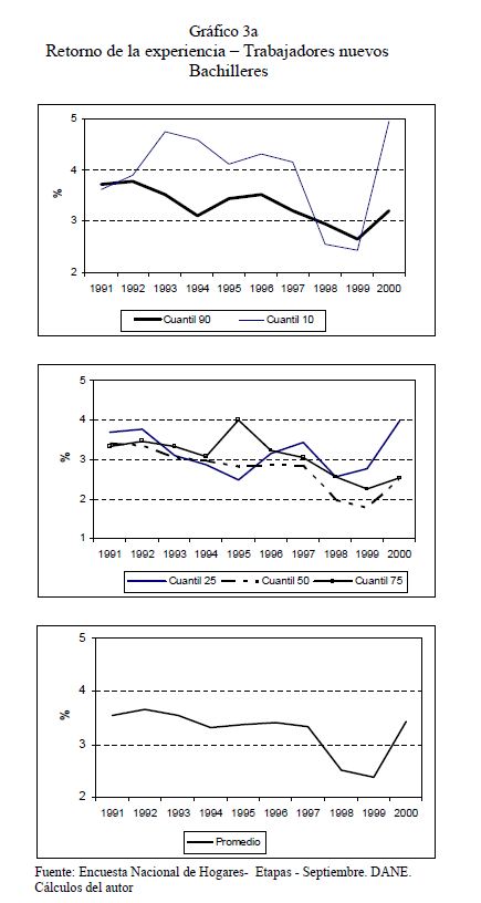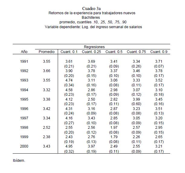 El objetivo principal de éste artículo es analizar el cambio en los retornos de la educación y la experiencia en diferentes puntos de la distribución salarial a través de una aplicación empírica en el mercado laboral colombiano. También, se analiza la evolución de la desigualdad salarial y sus características distribucionales para el período de 1991 a 2000. El artículo se basa en la ecuación de Mincer y utiliza la técnica semi-paramétrica de regresión cuantílica. Los datos se obtienen de las Encuestas Nacionales de Hogares. Aunque los retornos tienen patrones de comportamiento similares, las magnitudes y la variabilidad difieren entre los cuantiles analizados. La desigualdad salarial se incrementó en el final del periodo de estudio de acuerdo a las habilidades de cada grupo.