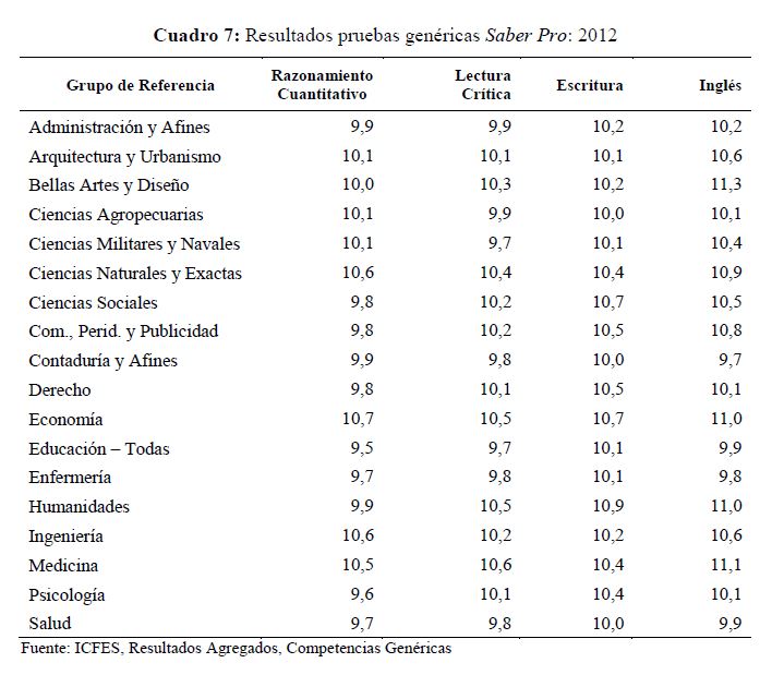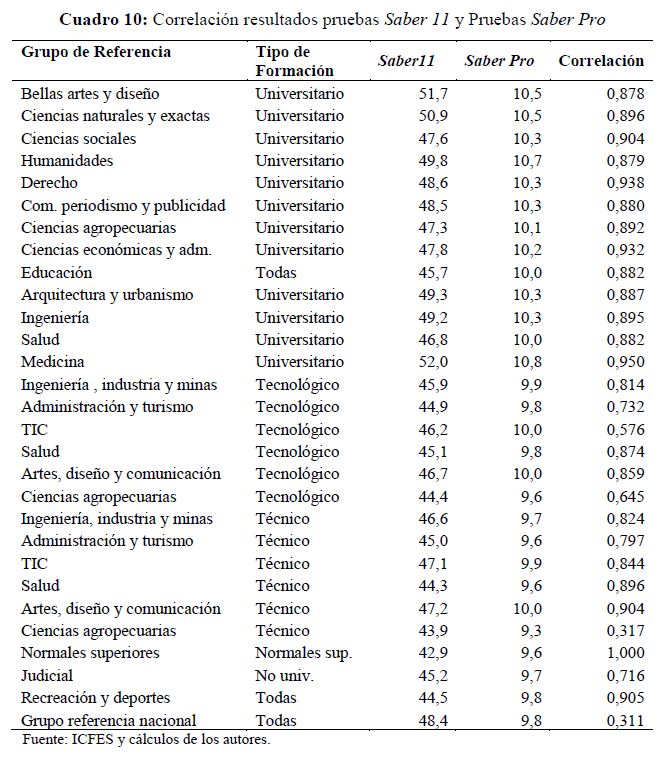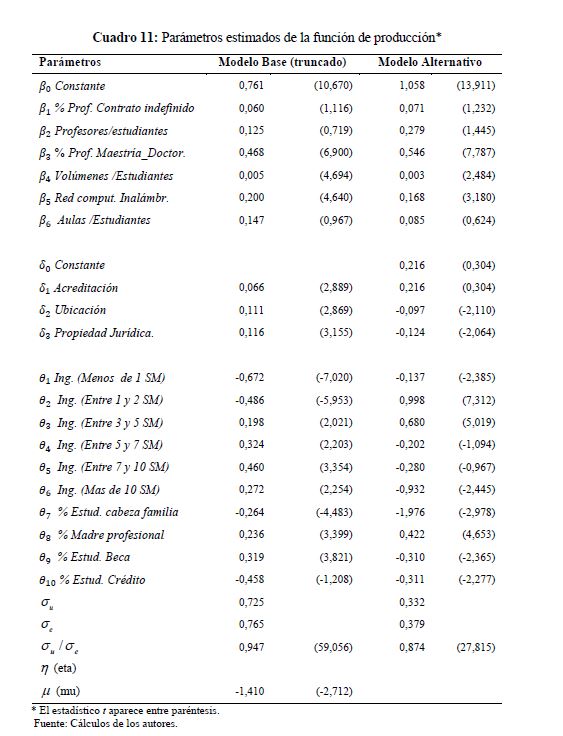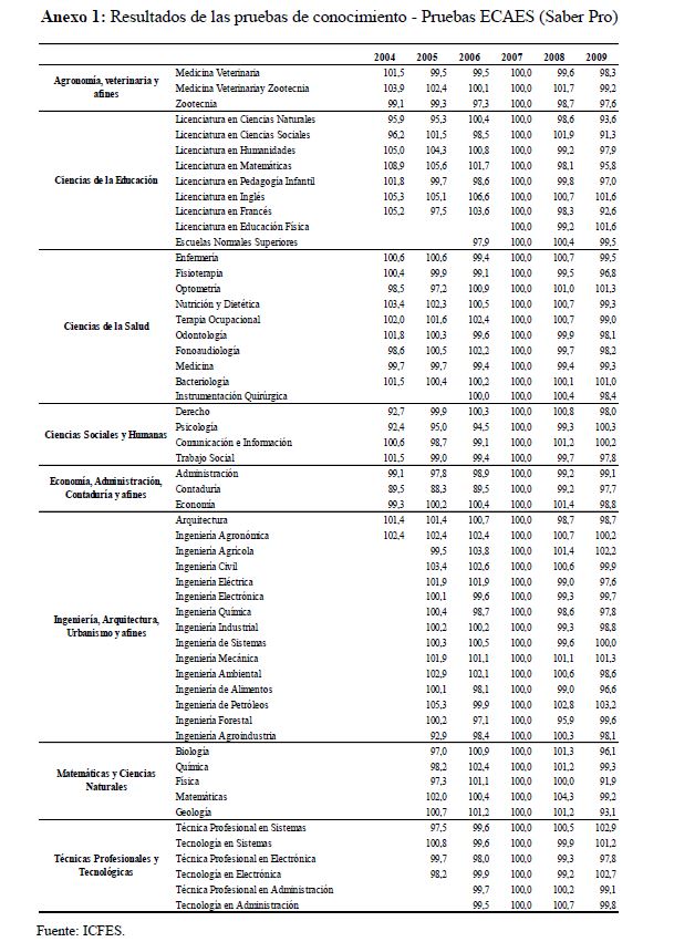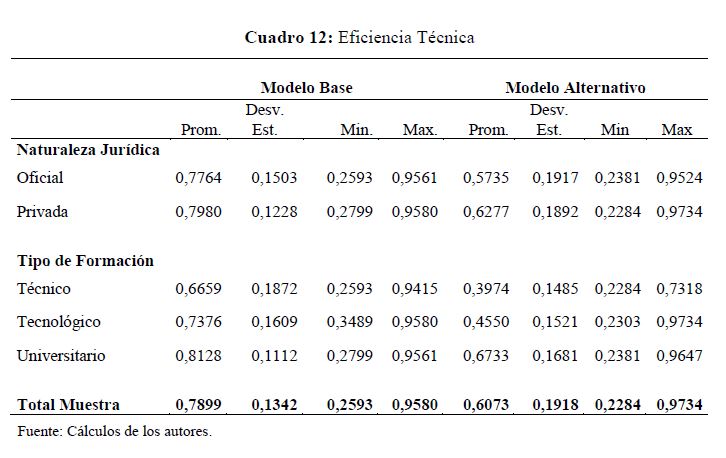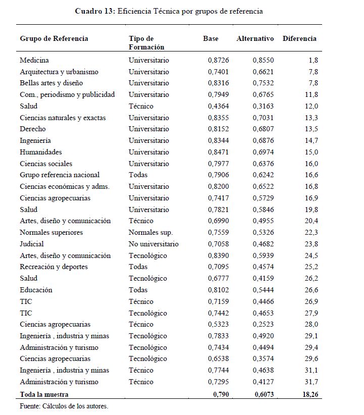La investigación tiene como objetivo revisar de manera general la situación de la educación superior en Colombia y evaluar los niveles de eficiencia de los diferentes programas e instituciones del país. Para el análisis de eficiencia se utilizan técnicas de frontera estocástica y los resultados de las pruebas Saber Pro. La estimación evalúa el impacto tanto de variables asociadas al personal docente y a la infraestructura de las instituciones, como de algunos factores de entorno que no están directamente bajo el control de las instituciones. Los resultados indican que existe una respuesta positiva y significativa entre el logro académico y las variables de infraestructura y las asociadas al personal docente. Los resultados igualmente resaltan la importancia de los factores de entorno para explicar el desempeño de las instituciones de educación superior, sugiriendo que aunque muchas instituciones educativas tienen un margen para mejorar sus niveles de eficiencia, podrían estar restringidas por la influencia de los factores socioeconómicos de los estudiantes.