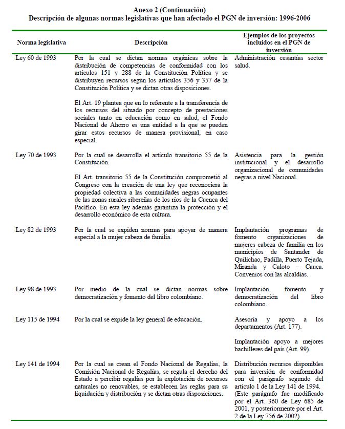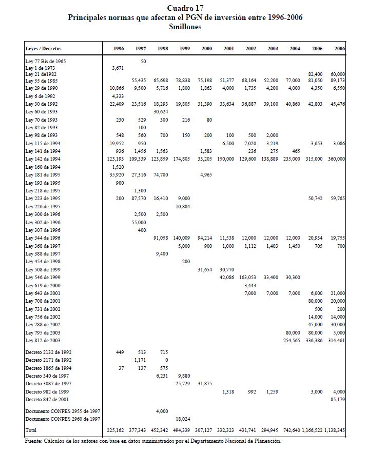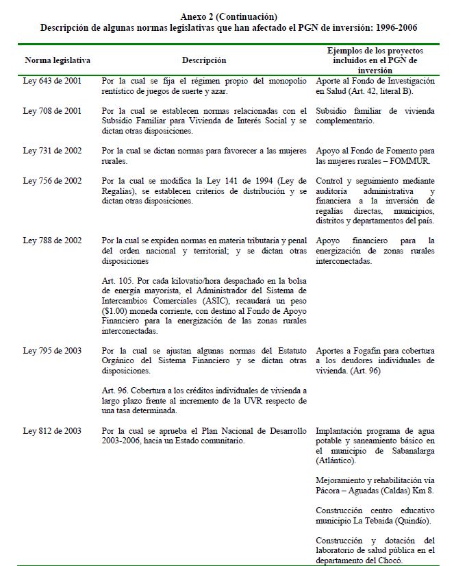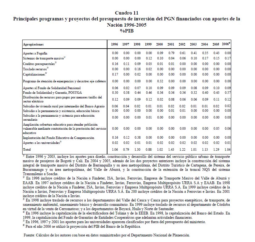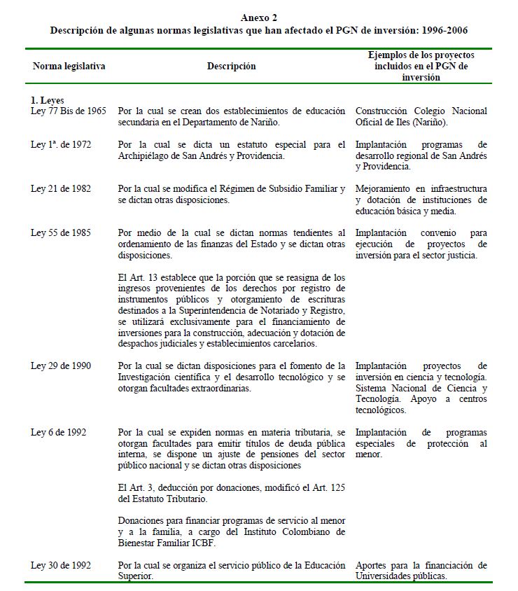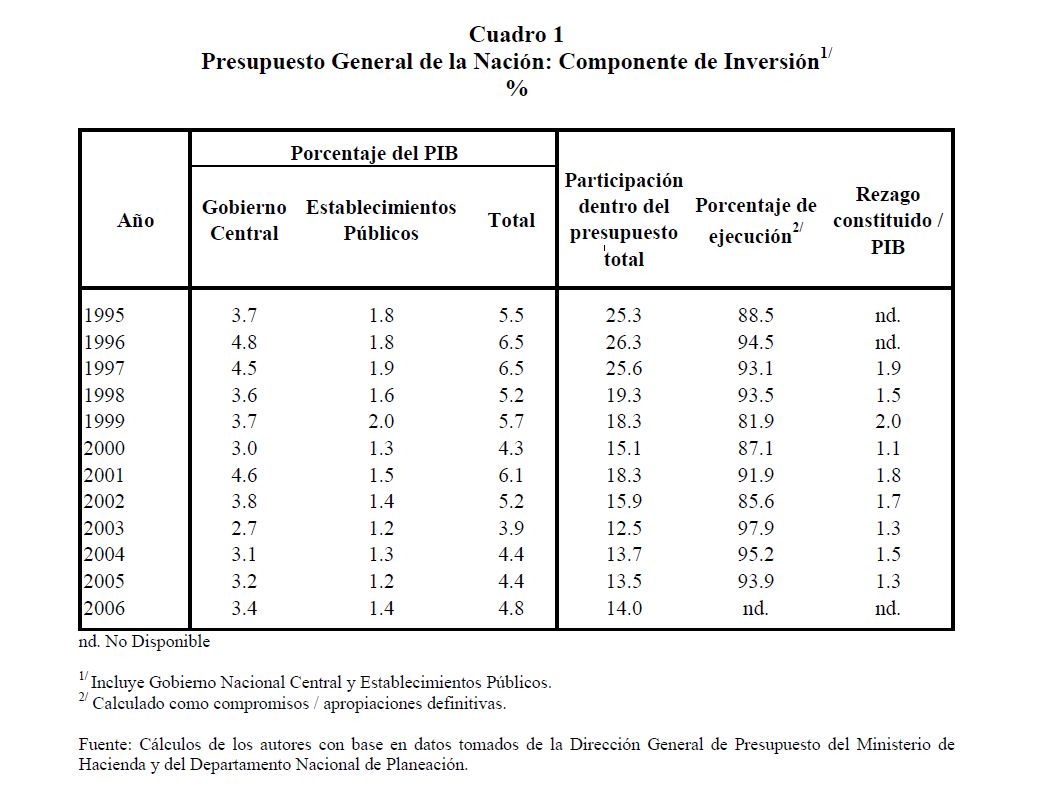 En este documento se presenta una descripción de las características y los aspectos más importantes del componente de inversión del Presupuesto General de la Nación. Se analiza el destino y distribución de los recursos, las interrelaciones entre el marco normativo y el proceso de programación presupuestal y el vínculo entre la política y la asignación de los recursos públicos. En términos generales el componente de inversión del PGN corresponde a una recopilación de proyectos de diferente naturaleza, de los cuales un porcentaje relativamente pequeño se asigna a infraestructura y adquisición de equipo. Este hecho contrasta con la definición de inversión de las cuentas nacionales que corresponde a formación bruta de capital fijo.
