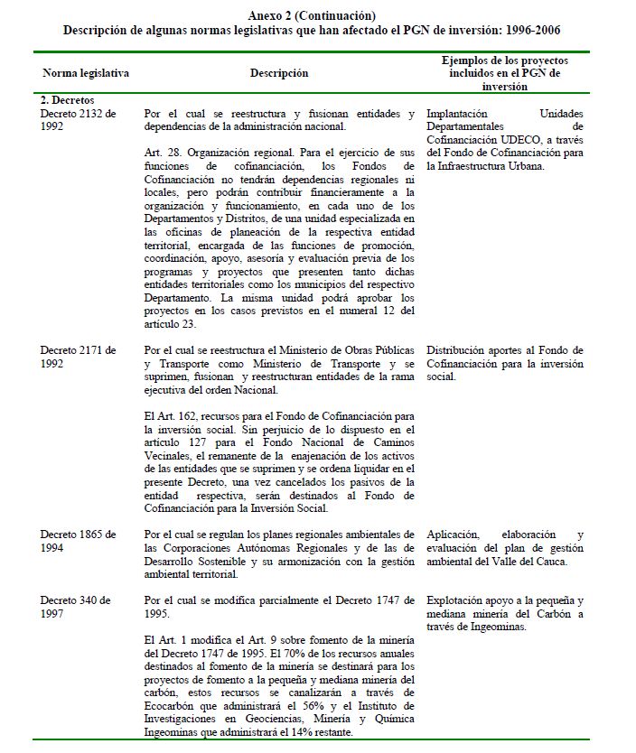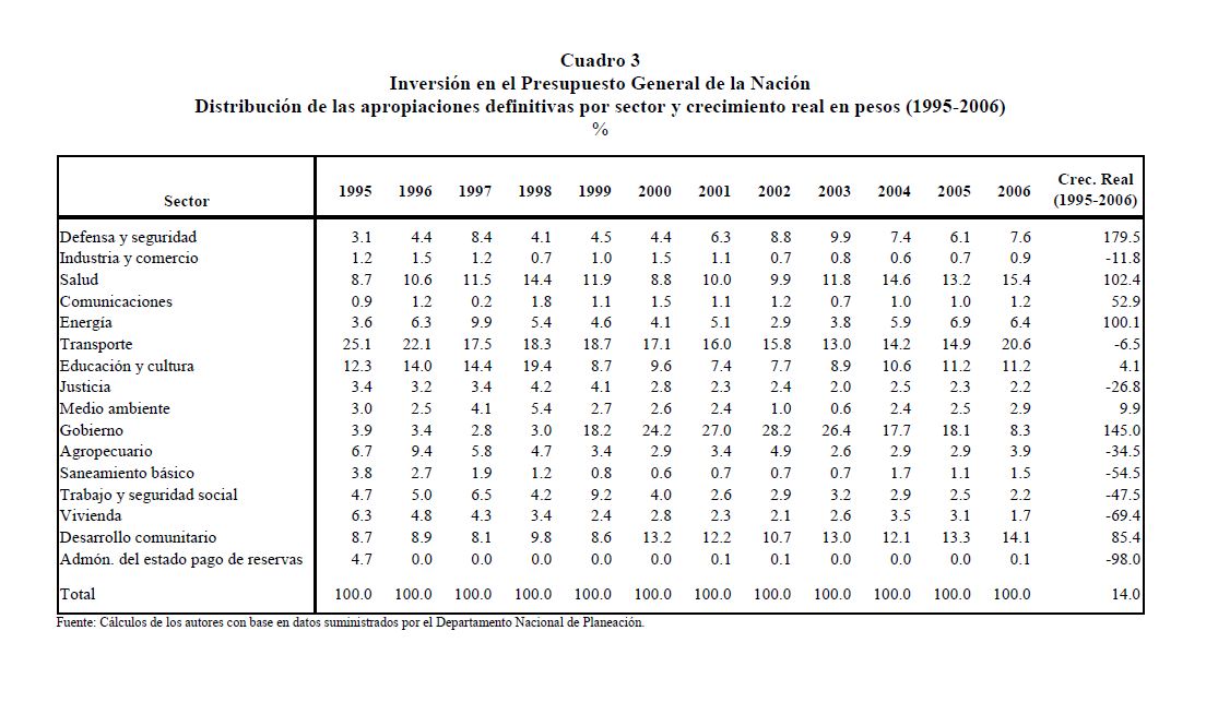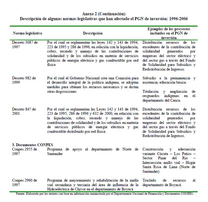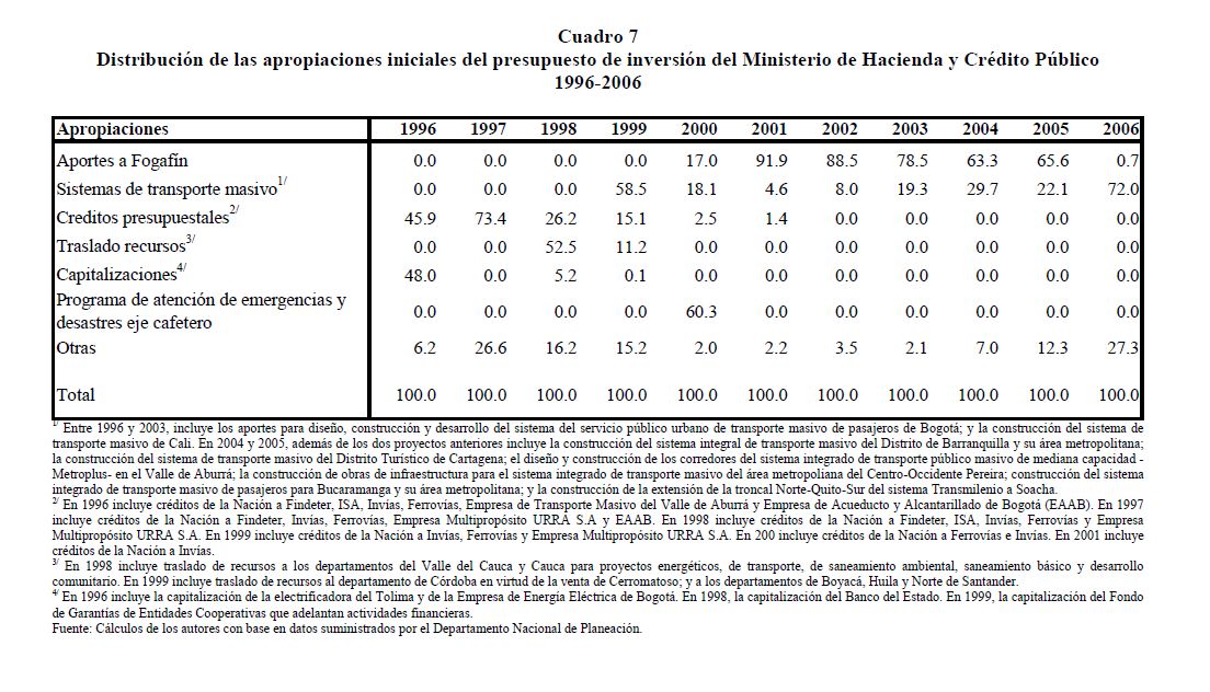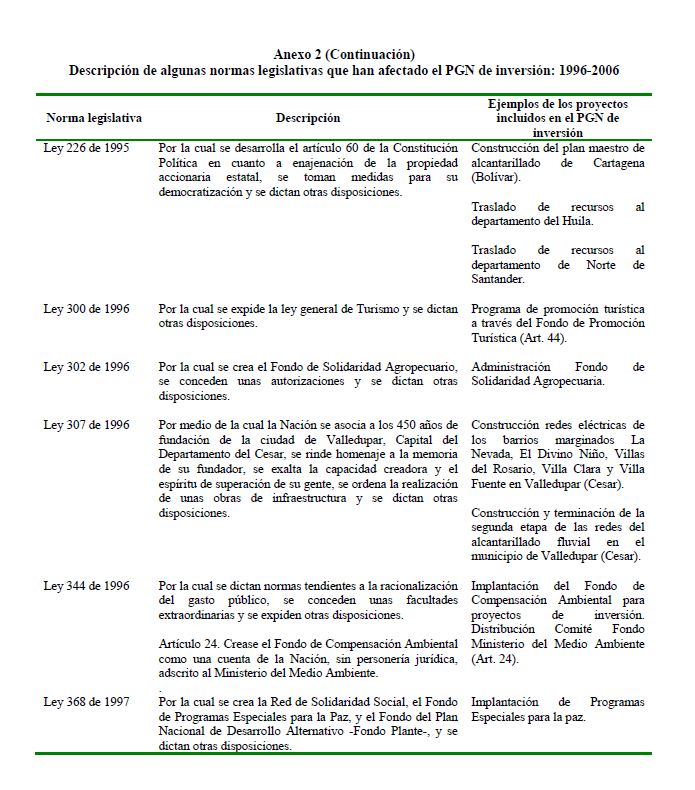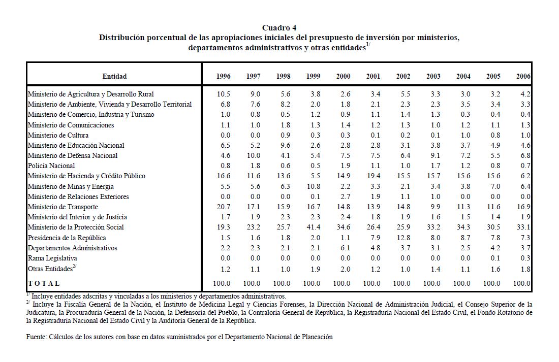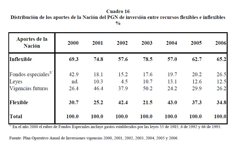 En este documento se presenta una descripción de las características y los aspectos más importantes del componente de inversión del Presupuesto General de la Nación. Se analiza el destino y distribución de los recursos, las interrelaciones entre el marco normativo y el proceso de programación presupuestal y el vínculo entre la política y la asignación de los recursos públicos. En términos generales el componente de inversión del PGN corresponde a una recopilación de proyectos de diferente naturaleza, de los cuales un porcentaje relativamente pequeño se asigna a infraestructura y adquisición de equipo. Este hecho contrasta con la definición de inversión de las cuentas nacionales que corresponde a formación bruta de capital fijo.