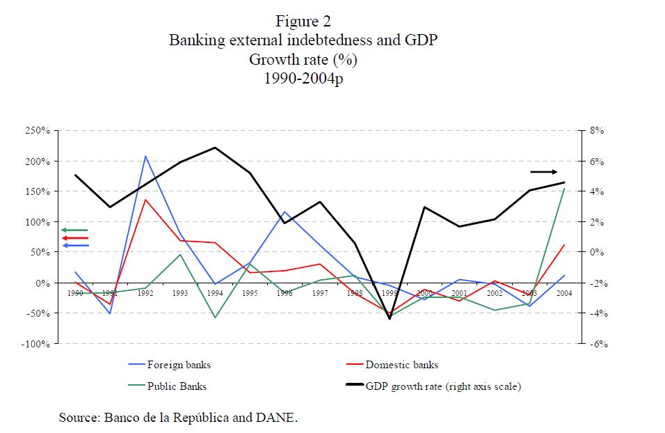 In this paper we try to elucidate the relationship between foreign and domestic banks external indebtedness and the business cycle in Colombia. After a brief review of related literature, we characterize the historical behavior of banking external indebte