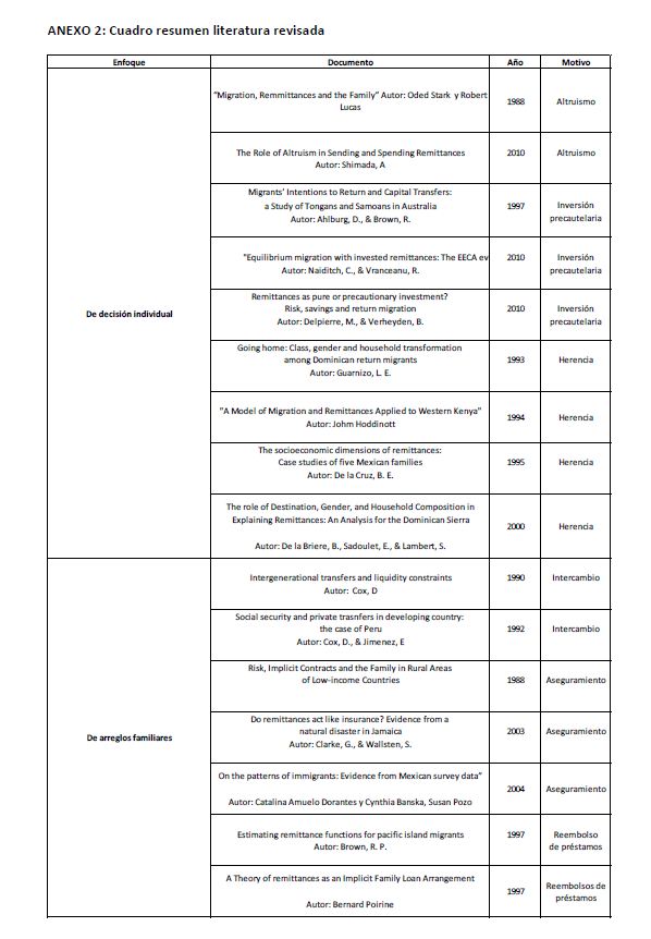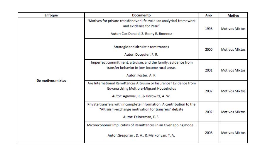El aumento de los flujos migratorios y la importancia de los flujos de remesas hacia países emergentes han motivado desde los años 70’s el estudio de los determinantes de las remesas. El primer paso para acercarse a este problema es entender las motivaciones microeconómicas de los agentes que deciden enviar dinero a sus familias en el país de origen. Este documento hace un repaso de literatura que se han desarrollado para describir los incentivos de los migrantes a enviar remesas. Se hace un análisis microeconómico desde 3 enfoques: el de decisión individual, el de arreglos familiares y el de motivos mixtos.