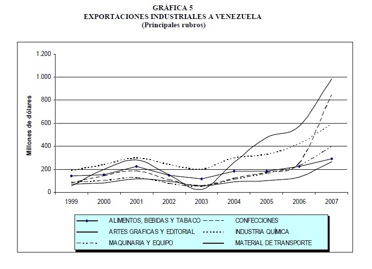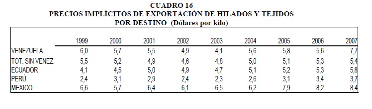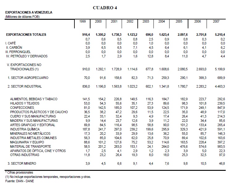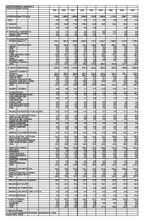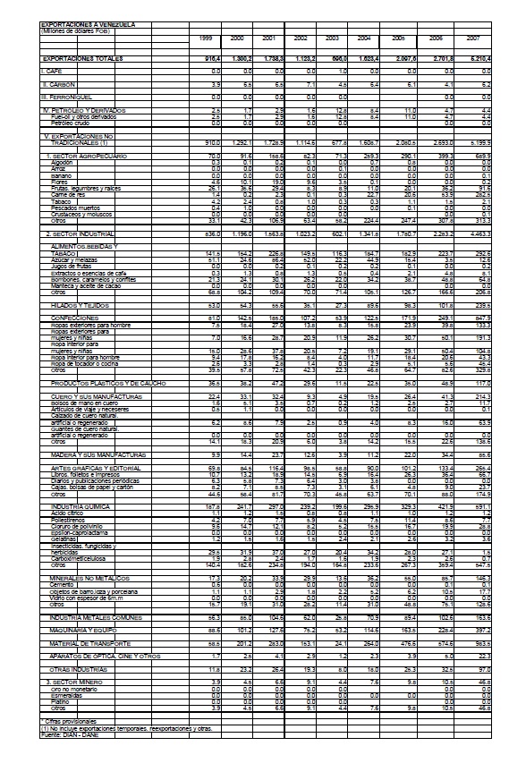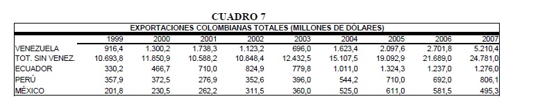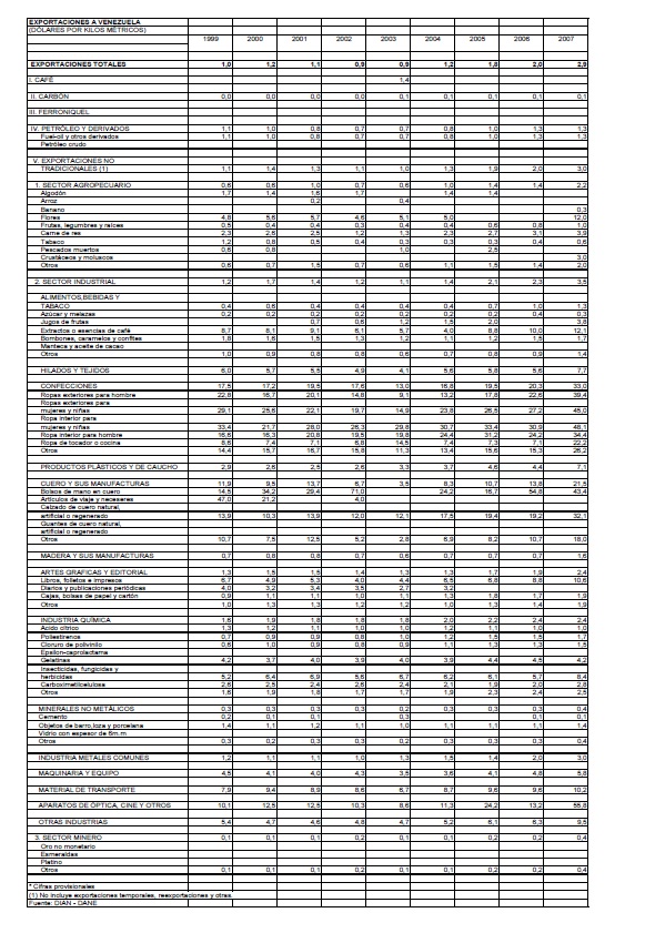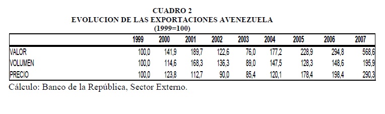 Las exportaciones colombianas hacia Venezuela han venido creciendo en forma notoria en el valor, y en menor grado en el volumen. En este documento se analiza el comportamiento de los precios implícitos (precios) de las exportaciones colombianas hacia Venezuela, principalmente; y comparada su evolución con los precios pagados por Ecuador, Perú, México y Estados Unidos. Tal análisis comprende los años entre 1999 y 2007, período que comprende años anteriores y posteriores a la crisis económica y laboral en Venezuela. Hacia el mercado venezolano se dirige básicamente el rubro de productos ?no tradicionales?, que para el año 2007 se convirtió en el principal comprador debido a los menores despachos de productos colombianos hacia los Estados Unidos. El 05r crecimiento del valor exportado frente al del volumen despachado no se concentra exclusivamente en Venezuela. También este fenómeno se presentó en las exportaciones hacia mercados como el mexicano, peruano y el de los Estados Unidos. En general hacia estos países, los valores exportados aumentaron más que sus cantidades enviadas, especialmente en productos tales como, material de transporte, confecciones, textiles y productos agropecuarios.
