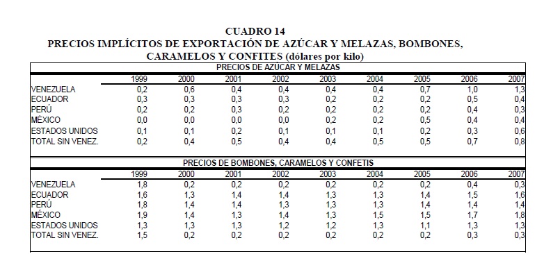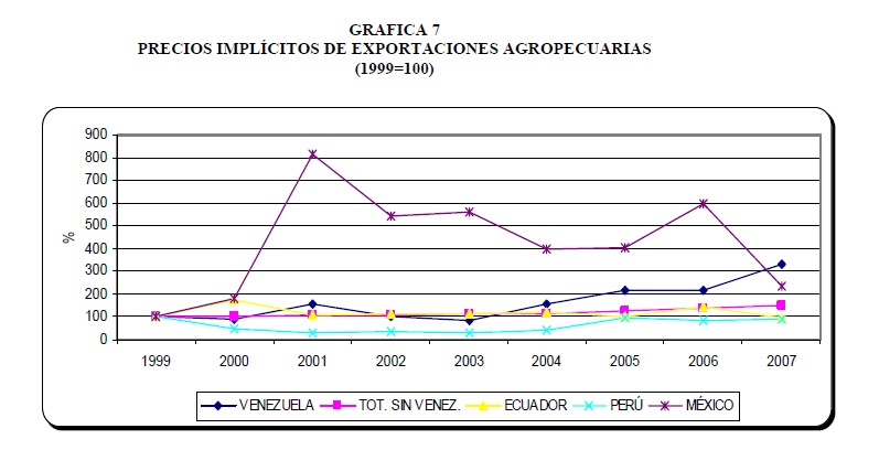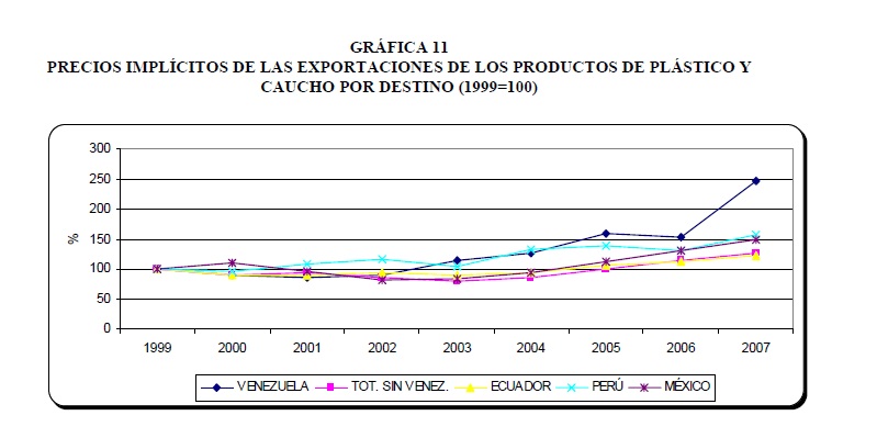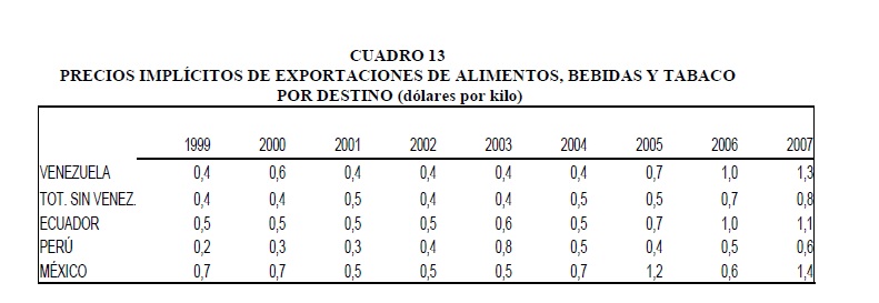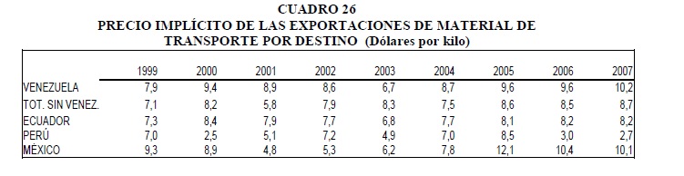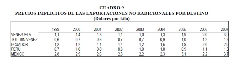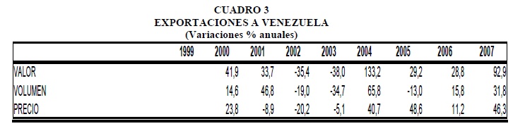 Valor y precio de las exportaciones colombianas a Venezuela entre 1999-2007 frente a tres países de referencia