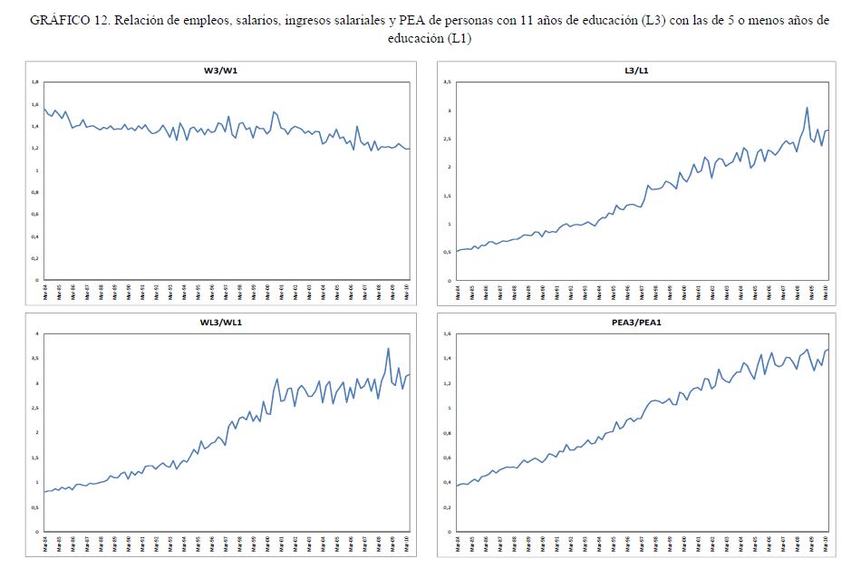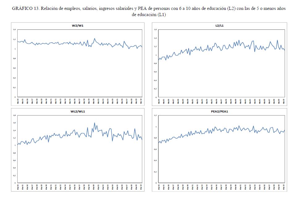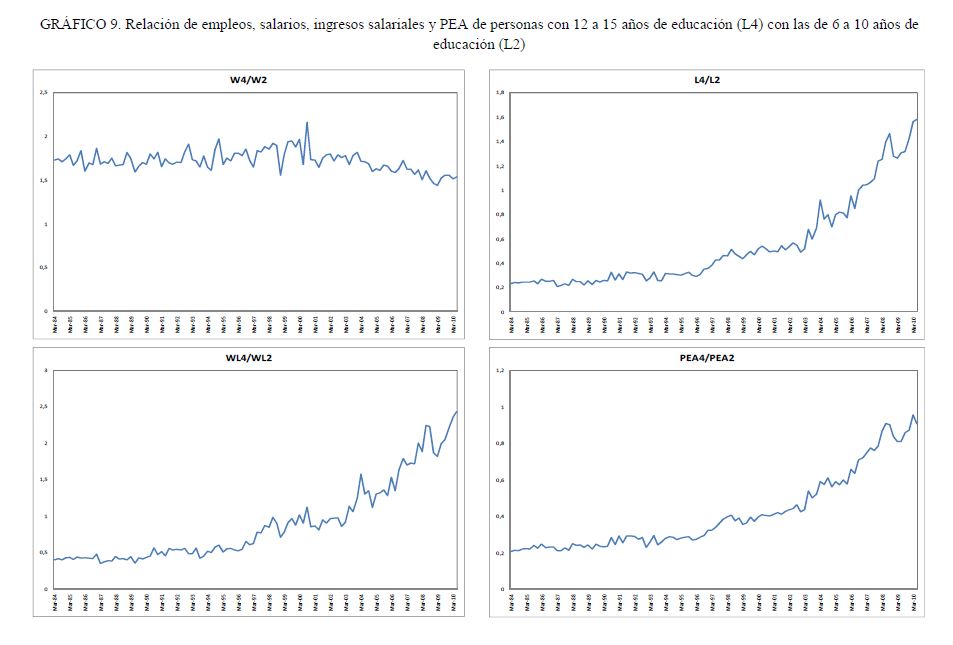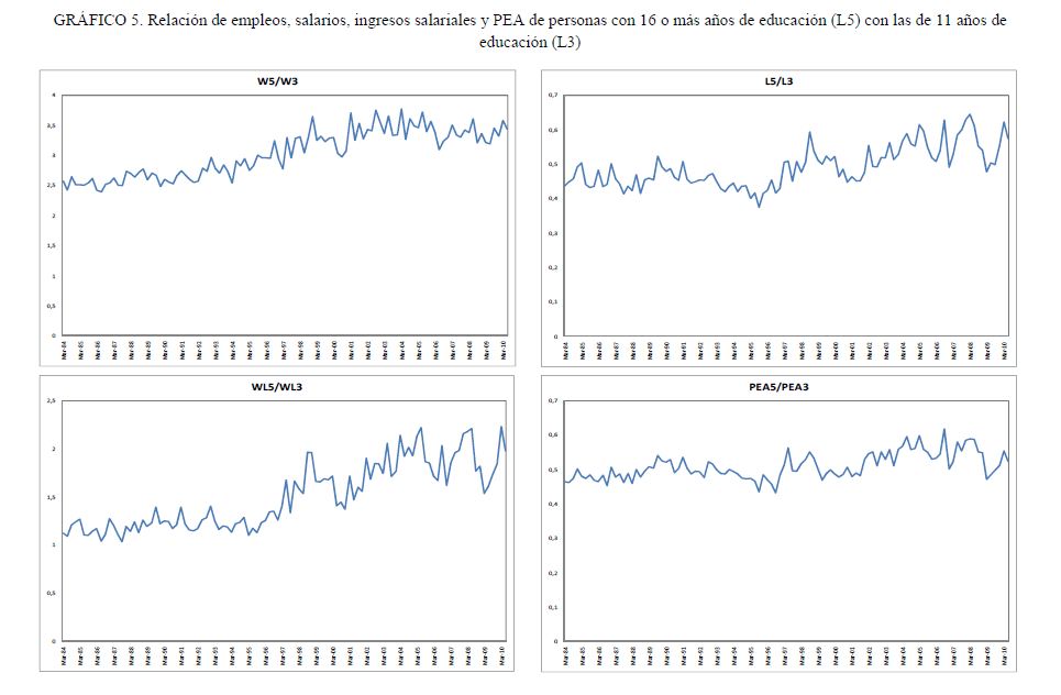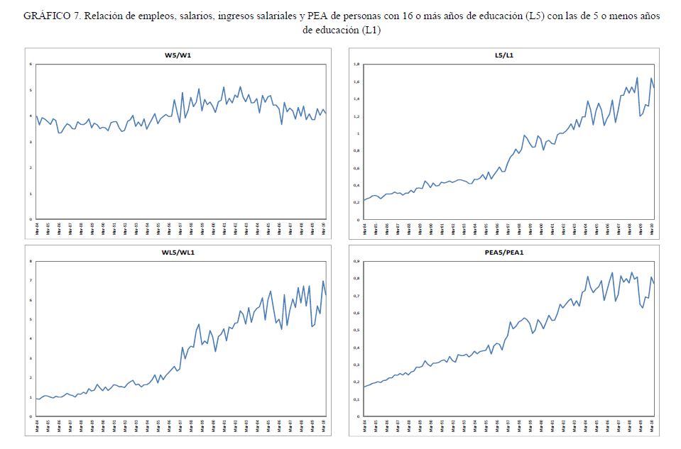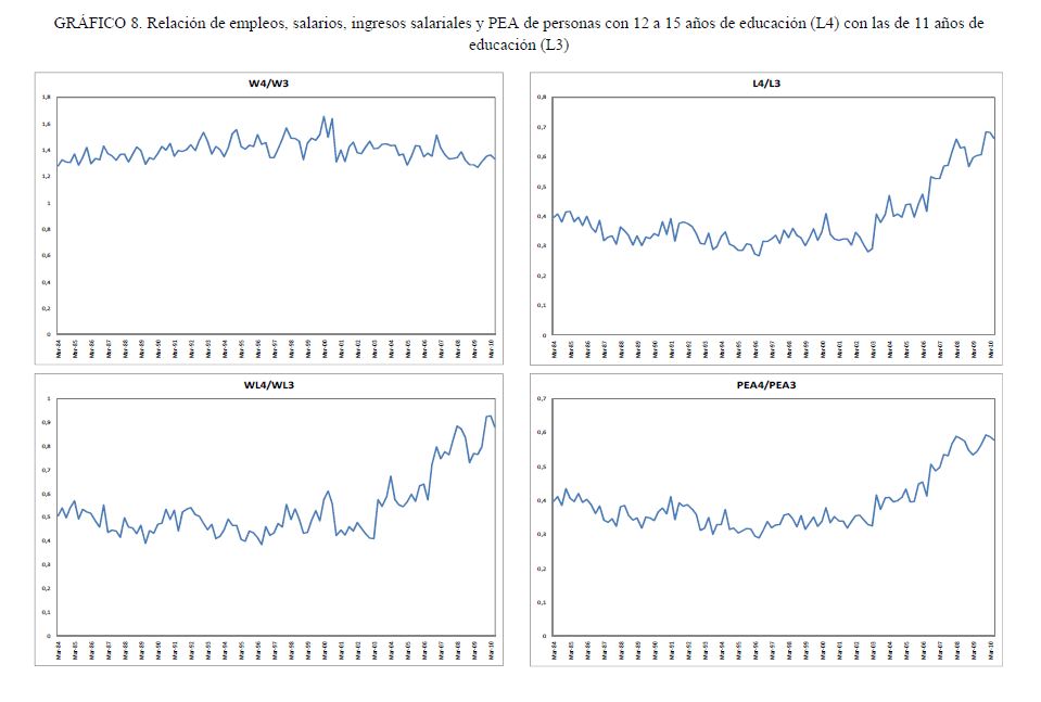La evidencia muestra que la oferta y el precio del trabajo calificado relativo al trabajo no calificado han cambiado significativamente en los últimos decenios en Colombia. Los resultados sugieren que Colombia ha experimentado un cambio tecnológico sesgado hacia trabajadores universitarios. Usando regresión por cuantiles, se encontró convergencia en los salarios de los grupos educativos más bajos y disminución en la dispersión de salarios de esos grupos desde mediados de los 90s. Así mismo, el diferencial de salarios entre los trabajadores más y menos educados se ha incrementado a partir de la segunda mitad de los 90s.