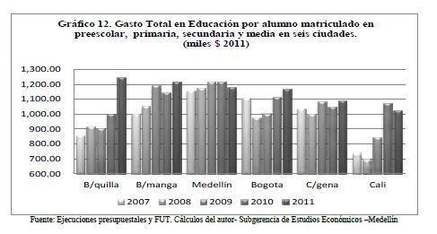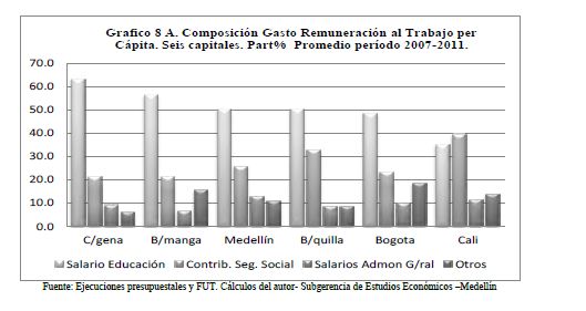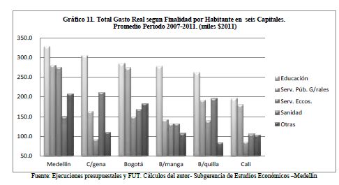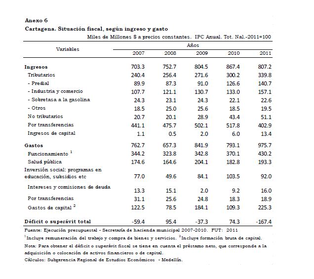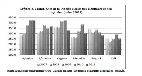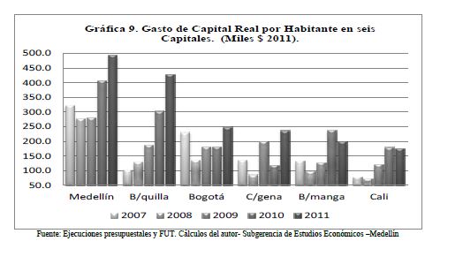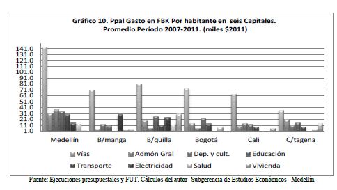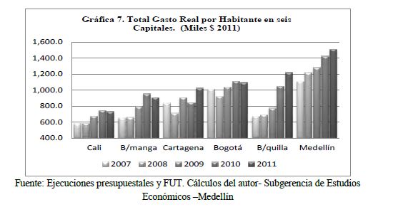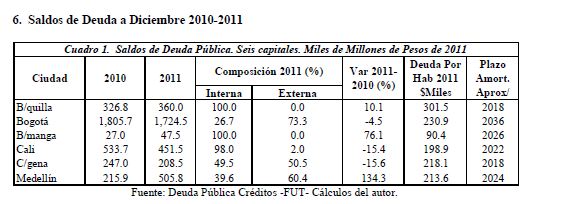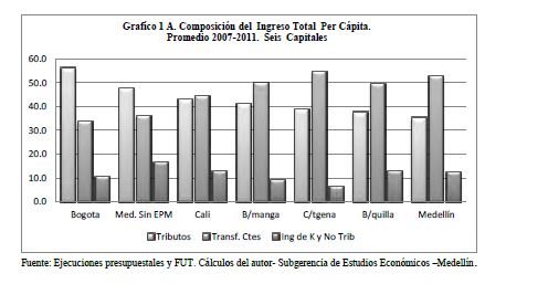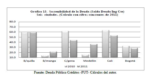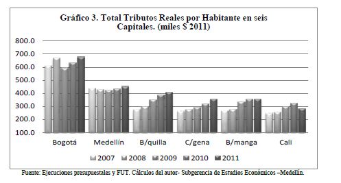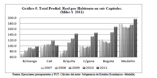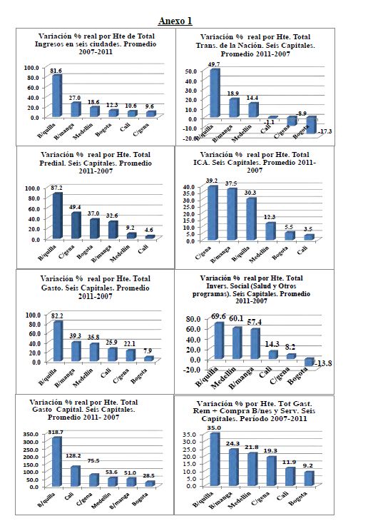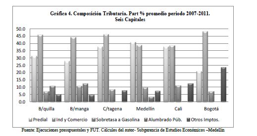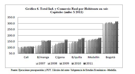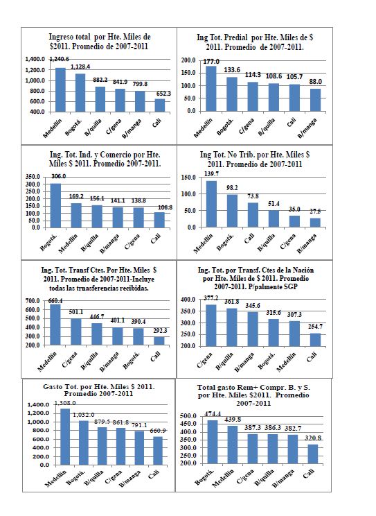 The article analyzes the evolution between 2007 and 2011, of the fiscal figures of the main six Colombian cities based on their earnings in 2011: Bogotá, Medellín, Cali, Barranquilla, Cartagena and Bucaramanga. The city that registered the largest advance