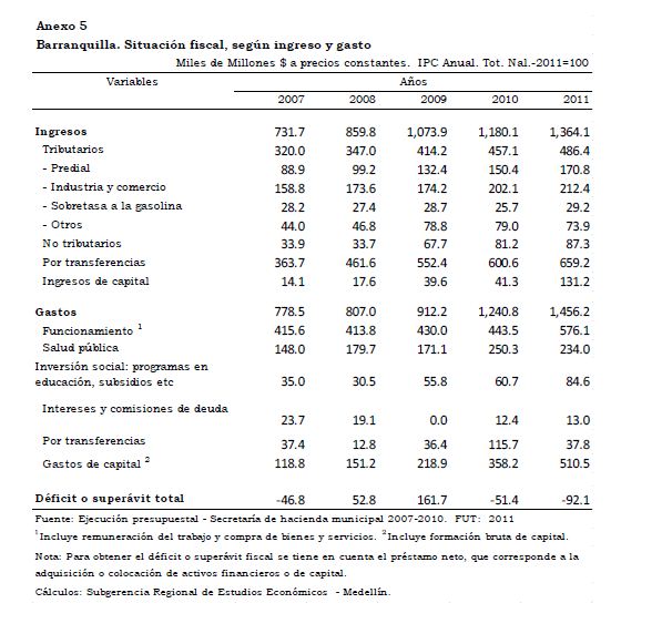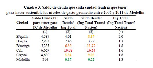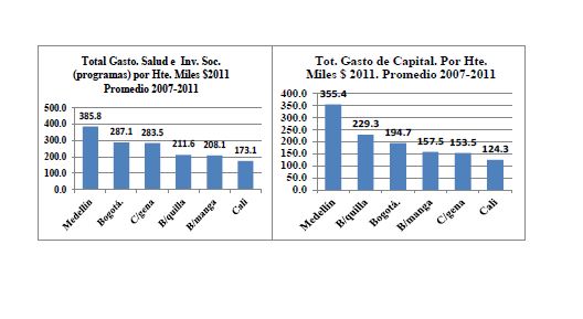 Este artículo analiza la evolución entre 2007 y 2011, de las cifras fiscales de las seis ciudades con 05res ingresos en 2011 en Colombia: Bogotá, Medellín, Cali, Barranquilla, Cartagena y Bucaramanga. La ciudad que registró 05res progresos en términos de esfuerzo fiscal en el período analizado fue Barranquilla, seguida de Bucaramanga. Más recientemente, Cartagena también incrementó en forma destacable sus ingresos propios. Cuando se califica el desempeño fiscal con base en la magnitud del gasto por habitante que sea sostenible para las ciudades, Medellín se resalta en el primer lugar, seguida relativamente de cerca de Bogotá. Barranquilla y Cartagena vendrían después, con cierta distancia de las dos primeras; posteriormente Bucaramanga, y finalmente, y con un desempeño bastante pobre, Cali.