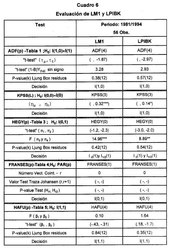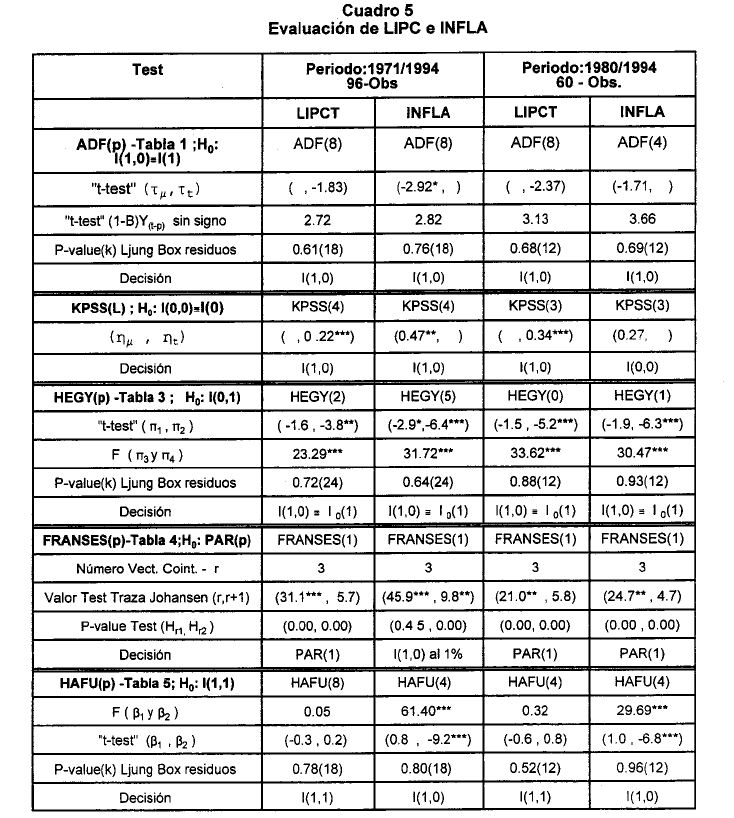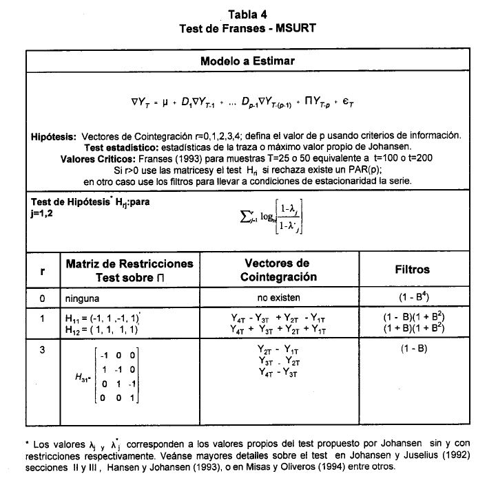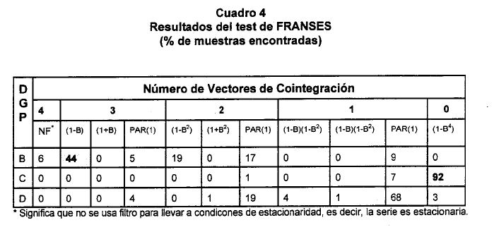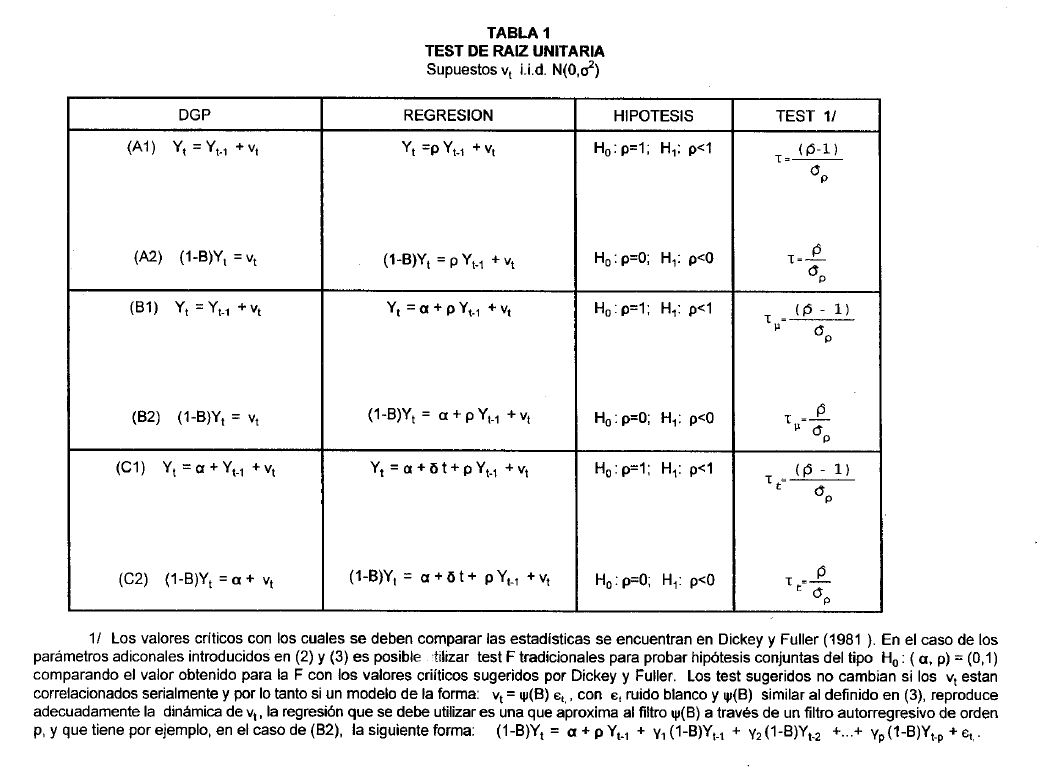 Como lo señalan Campbell y Peron (1991) las dificultades que ofrece la estimación de modelos con variables que presentan tendencia estocástica están asociados con varios hechos, de los cuales sobresalen los siguientes: (i) las distribuciones teóricas estándar(1) no pueden ser utilizadas en pruebas de hipótesis que involucran a dichas series; (ii) la potencia de test en muestras pequeñas es limitada(2), (iii) los procedimientos de evaluación de la presencia de raíz unitaria de algunos casos pueden desarrollarse a partir de un proceso secuencial, lo que implica una pérdida de potencia en los test que podría deteriorarse, aún más, en la medida en que el investigador desconoce el verdadero DGP, (el verdadero proceso generador de los datos); (iv) la sobre (sub) parametrización del modelo para capturar componentes de tendencia determinística disminuye (aumenta) la potencia del test cuando se tiene como hipótesis alterna a un proceso estacionario.