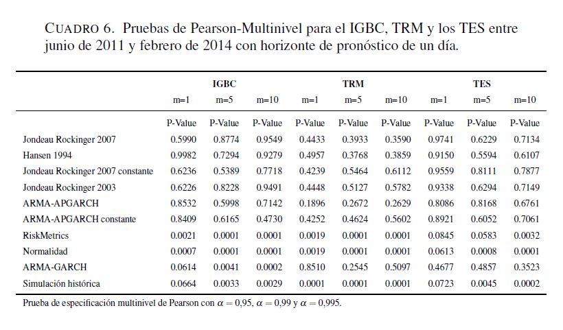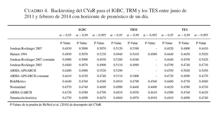 Las metodologías tradicionales utilizadas para calcular el valor en riesgo y el valor en riesgo condicional usualmente modelan el primer y segundo momento de las series, suponiendo que el tercer y cuarto momento son constantes. En este documento se utiliza la metodología de Hansen [1994] para modelar los primeros cuatro momentos de la serie, en particular, se usan varias formas paramétricas para modelar la asimetría y curtosis. Las medidas de VaR y CVaR tradicionales y las propuestas son calculadas para la Tasa Representativa del Mercado, los TES, y el IGBC para el periodo diario comprendido entre 01 de 2008 y 02 de 2014. En general, se encuentra que las medidas de riesgo de mercado presentan mejor desempeño al modelar la asimetría y la curtosis.