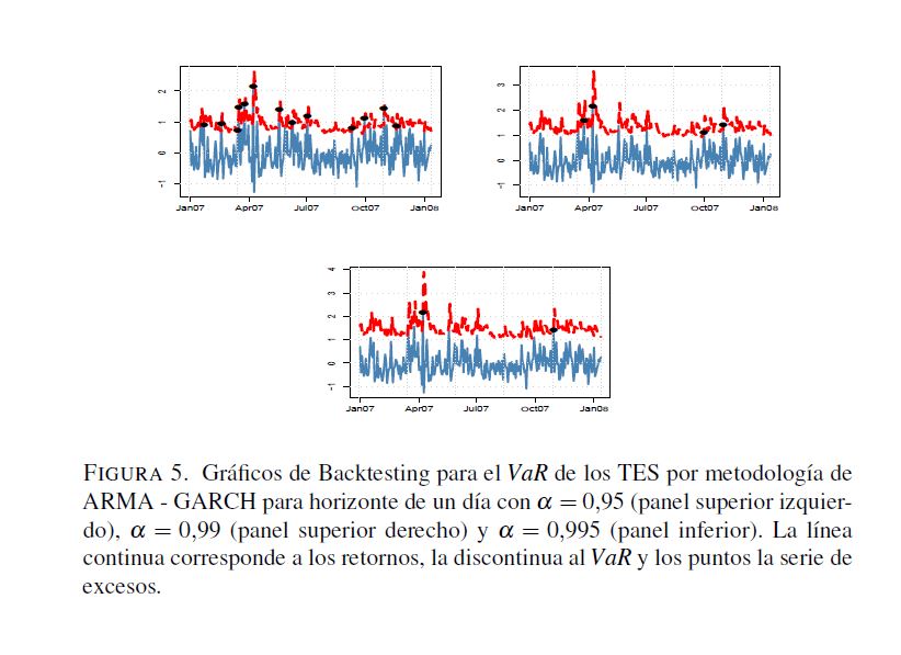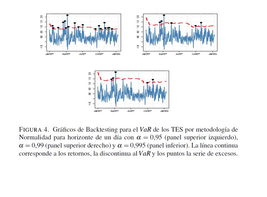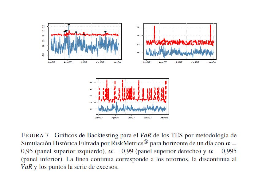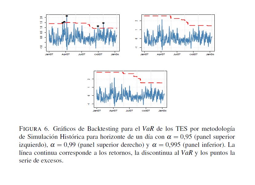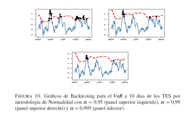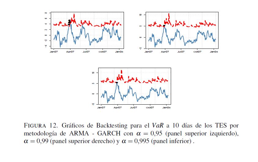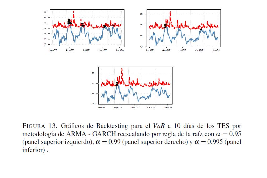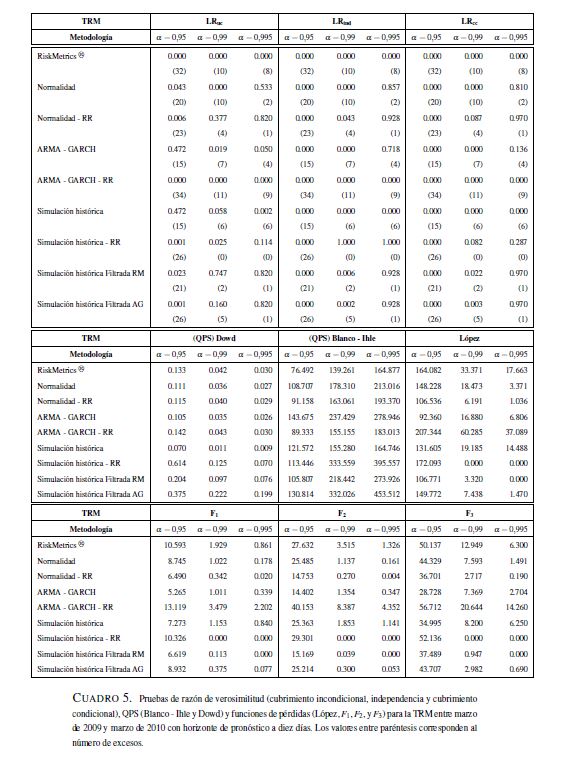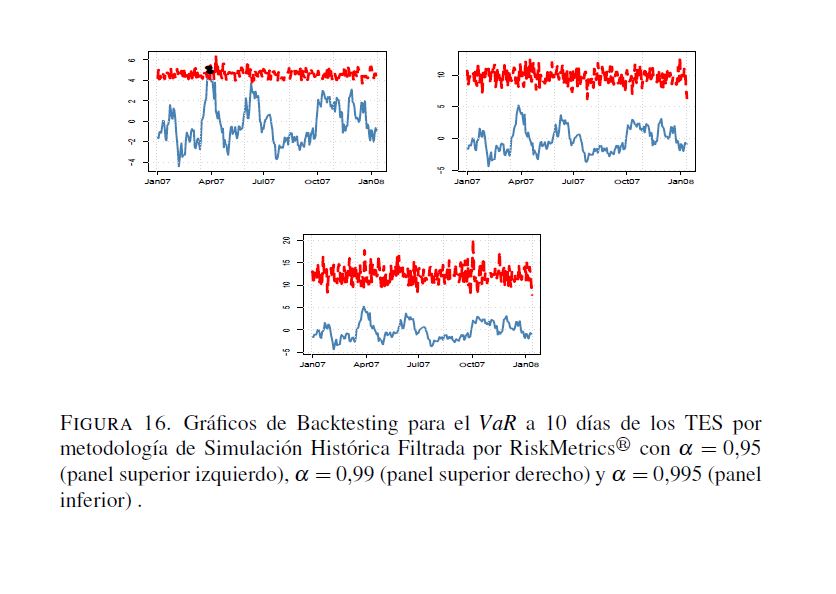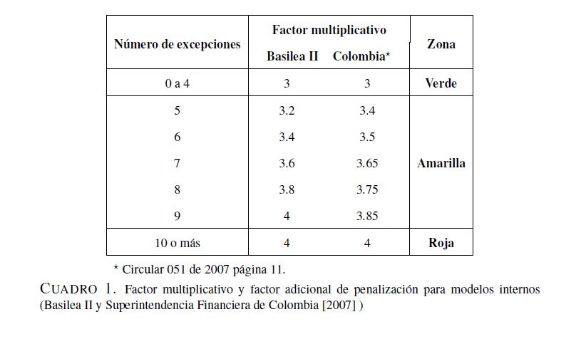 En este trabajo se analizan algunos aspectos de la regulación relacionada con el manejo del riesgo de mercado establecida por la Superintendencia Financiera de Colombia, donde se propone el valor en riesgo (VaR) como la medida para cuantificar este tipo de riesgo. No obstante, esta regulación omite aspectos relevantes sobre el cálculo del VaR. A pesar de que la Superintendencia Financiera sugiere el uso de la regla de la raíz para el cálculo del VaR en multiperiodos con base en el VaR para un día, la validez de dicha regla no es clara. Por otra parte, las pruebas de desempeño backtesting) pretenden validar si la metodología utilizada para el cálculo de VaR es correcta. Sin embargo, la regulación actual solo hace referencia al número de veces que las perdidas exceden el VaR, olvidándose de otros factores que son necesarios para la evaluación del desempeño de estas medidas. Para llevar a cabo los análisis relacionados con los efectos de la regla de la raíz y de diferentes metodologías de backtesting que evalúen todas las propiedades relevantes del VaR, este documento calcula dos medidas de riesgo, el VaR y el VaR condicional, utilizando metodologías de fácil implementación (RiskMetrics, ARMA-GARCH, simulación histórica, simulación histórica filtrada y normalidad) para la Tasa Representativa del Mercado, los TES, y el IGBC con un periodo muestral comprendido entre 01 de 2003 y 03 de 2010. Los resultados muestran que para horizontes de pronóstico de un día las metodologías consideradas miden apropiadamente el VaR. Los métodos con mejor desempeño son aquellos que modelan tanto la media como la varianza condicional. Por otro lado, para horizontes 05res a un día ninguna metodología tiene un desempeño adecuado. En particular, se encuentra que la regla de la raíz no genera estimaciones apropiadas del VaR multiperiodo. Es importante anotar que si solo se consideran los criterios de la regulación vigente, se tendrían algunos modelos adecuados para estimaciones multiperiodo. Sin embargo, cuando se tienen en cuenta supuestos adicionales que debe satisfacer el VaR, ninguna metodología es apropiada.