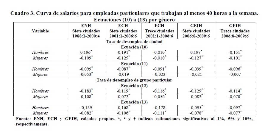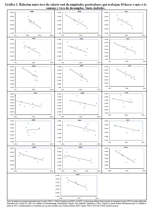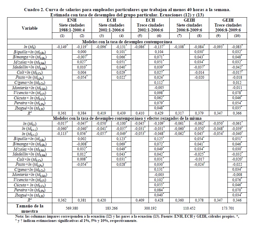 Se utiliza información de la Encuesta nacional de hogares (1984-2000), la Encuesta continua de hogares (2001-2006) y la Gran encuesta integrada de hogares (2006-2009) para estimar la curva de salarios (Blanchflower y Oswald, 1994). Se encuentra que los salarios responden a la tasa de desempleo en magnitudes que varían entre -0,083 y -0,149 lo cual se ajusta a la evidencia internacional. Por tanto, los salarios son sensibles a la tasa de desempleo. La curva se estima con diversas modificaciones y en todos los casos se encuentra evidencia de flexibilidad de los salarios.