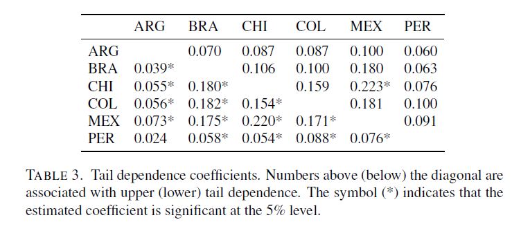 | dc.description.abstract | This study implements a regular vine copula methodology to evaluate the level of contagion among the exchange rates of six Latin American countries (Argentina, Brazil, Chile, Colombia, Mexico and Peru) from June 2005 to April 2012. We measure contagion in | eng |