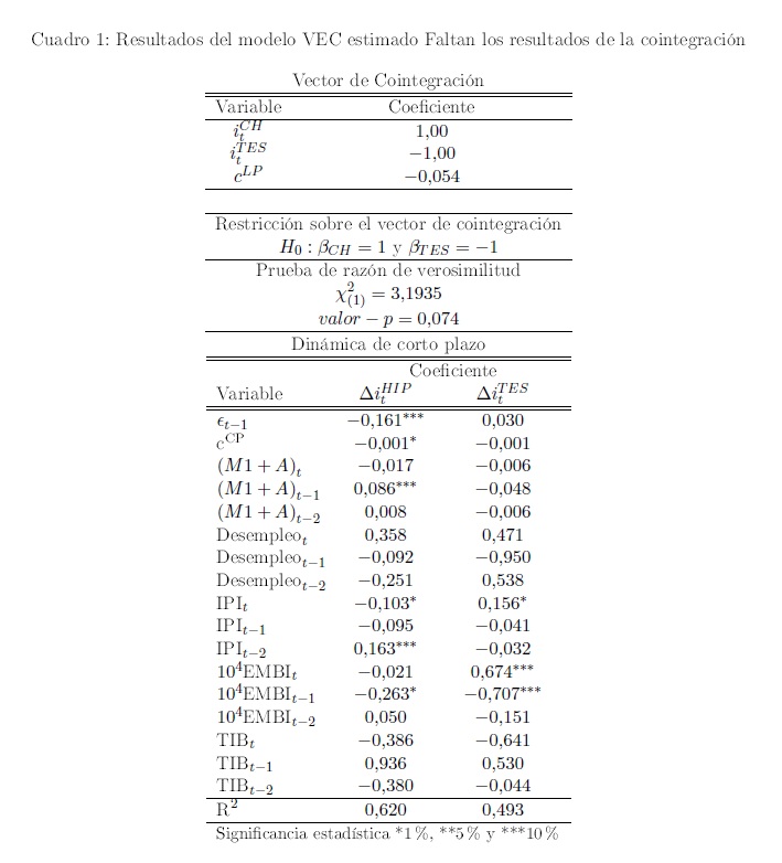 Este artículo presenta un análisis cuantitativo del impacto de la política monetaria sobre las tasas de interés de los créditos hipotecarios, tanto en el largo como en el corto plazo. En primer lugar, los resultados de los ejercicios econométricos confirman la existencia de una relación de cointegración, ya antes encontrada por Galindo y Hofstetter (2008), entre las tasas de interés de los créditos hipotecarios (TICH) y los rendimientos de los títulos de deuda pública (TES). A diferencia de dicho estudio, se concluye que en el largo plazo la relación entre ambas tasas es uno a uno. Por consiguiente, tanto la política monetaria (a través de una meta de inflación baja y creíble) como la política fiscal (a través de una 05r solvencia fiscal) pueden contribuir a reducir las TICH en el largo plazo. Segundo, en el corto plazo, se encuentra que una innovación de 100 puntos base a la tasa de interés de política del Banco de la República se transmite al spreads TICH-TES con un rezago de seis a 10 meses y tiene un efecto máximo de 40-60 pb, después de controlar por sus efectos sobre otras variables macroeconómicas.