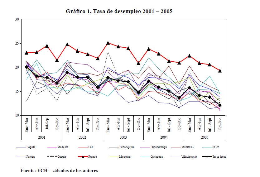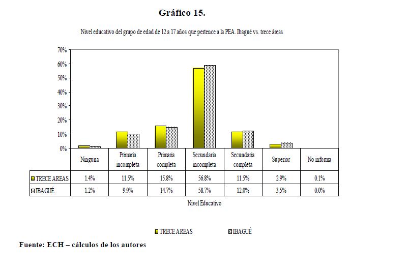 La alta tasa de participación laboral en Ibagué ha tenido como consecuencia que la tasa de desempleo en dicha ciudad haya sido la 05r en los últimos años en relación con las principales ciudades del país. Este trabajo presenta evidencia sobre los determinantes de la participación laboral de Ibagué para el período 2001-2005 y los compara con los determinantes de trece ciudades. Con base en la Encuesta Continua de Hogares se estiman tres modelos ?probit? de participación: uno para el total de trece áreas, otro para Ibagué y uno conjunto en el que se diferencia a Ibagué del promedio nacional. En general, los signos de los coeficientes son los esperados. El hecho fundamental es la alta participación de las personas que integran los grupos de 12 a 17 años. La participación del grupo de edad de 18 a 23 años es también importante. La baja remuneración en el mercado laboral y la caída en el empleo formal (de personas no beneficiarias del subsidio monetario entregado por las Cajas de Compensación Familiar) son las dos hipótesis básicas para explicar el fenómeno de la alta participación en Ibagué. Sin embargo, queda por responder la pregunta del porqué no emigran a otras ciudades.