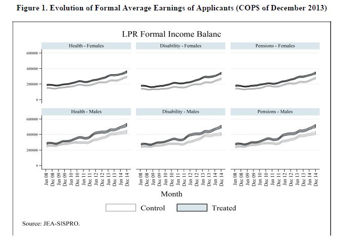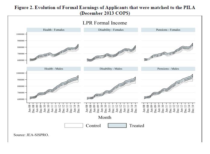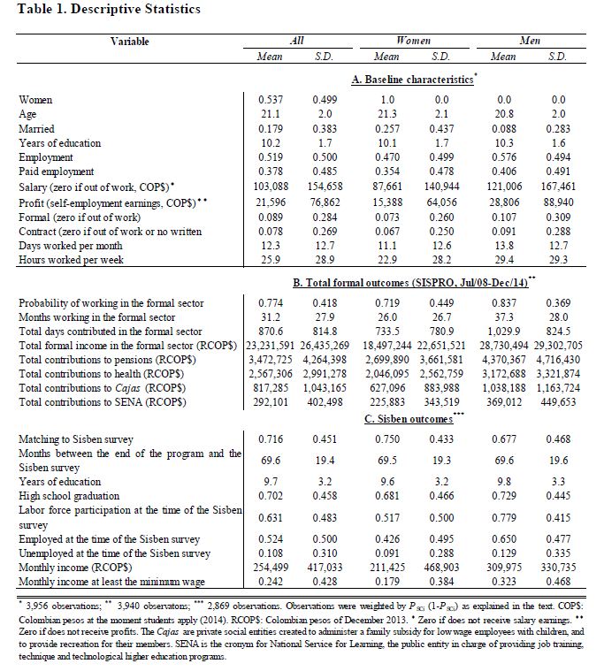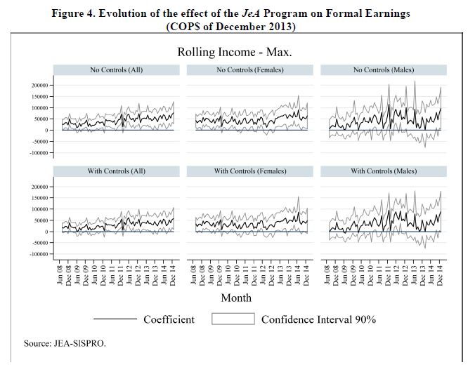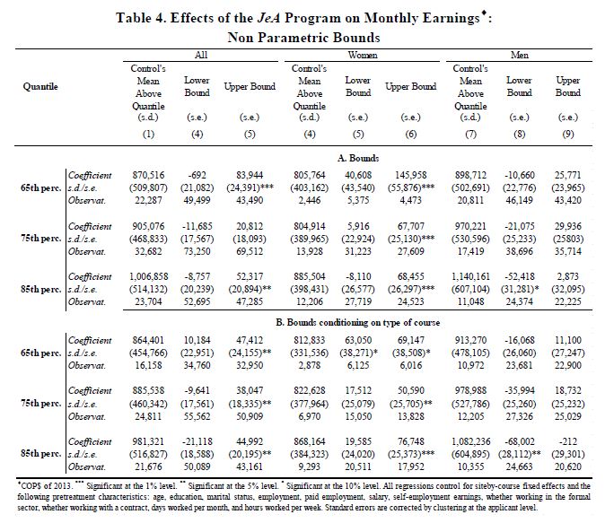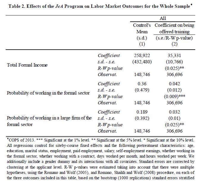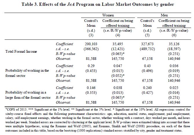 Con base en datos experimentales de un programa de formación para el trabajo implementado en 2005 Colombia, se encuentra que aun diez años después, el programa JeA tuvo un efecto positivo y significativo en la probabilidad de trabajar en el sector formal, y de trabajar en una firma grande. Los aplicantes en el grupo beneficiarios también contribuyeron más meses a seguridad social durante el período analizado. Los ingresos de los aplicantes beneficiarios fueron 11.8% más altos en el total de la muestra, e hicieron 05res contribuciones a la seguridad social. También presentamos cotas no paramétricas que muestran que para algunos percentiles de la muestra de mujeres, hay efectos positivos y cercanamente significativos del programa, por lo cual, los efectos del programa habrían sido capitalizados tanto en incrementos en la probabilidad de ser formales, como en la productividad. También se presenta evidencia de que los efectos estimados del programa en la probabilidad de trabajar para el sector formal, en la probabilidad de trabajar para una firma grande, y en los 05res ingresos en el sector formal, no son un artefacto de analizar múltiples resultados. Se encuentra que los beneficiarios tienen 0.315 años adicionales de educación, y tienen una probabilidad de graduarse de bachillerato 10% 05r. No se encuentran efectos significativos en la probabilidad de asistir a la universidad o cualquier otro programa académico, en decisiones de fertilidad, estado civil u otras dimensiones de segregación marital. Entre los aplicantes que se observaron en el censo de la población más pobre, se encuentra que los beneficiarios tienen 05r probabilidad de participar en el mercado laboral, de estar ocupados, y de tener seguro de salud privado al momento de la encuesta. Finalmente, se encuentra que los beneficios del programa JeA son 05res que sus costos, implicando tasas de retorno de al menos un 22.1%.