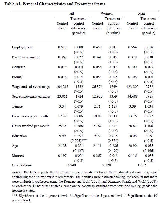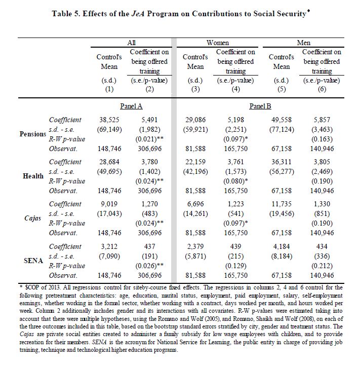 | dc.description | Con base en datos experimentales de un programa de formación para el trabajo implementado en 2005 Colombia, se encuentra que aun diez años después, el programa JeA tuvo un efecto positivo y significativo en la probabilidad de trabajar en el sector formal, y de trabajar en una firma grande. Los aplicantes en el grupo beneficiarios también contribuyeron más meses a seguridad social durante el período analizado. Los ingresos de los aplicantes beneficiarios fueron 11.8% más altos en el total de la muestra, e hicieron 05res contribuciones a la seguridad social. También presentamos cotas no paramétricas que muestran que para algunos percentiles de la muestra de mujeres, hay efectos positivos y cercanamente significativos del programa, por lo cual, los efectos del programa habrían sido capitalizados tanto en incrementos en la probabilidad de ser formales, como en la productividad. También se presenta evidencia de que los efectos estimados del programa en la probabilidad de trabajar para el sector formal, en la probabilidad de trabajar para una firma grande, y en los 05res ingresos en el sector formal, no son un artefacto de analizar múltiples resultados. Se encuentra que los beneficiarios tienen 0.315 años adicionales de educación, y tienen una probabilidad de graduarse de bachillerato 10% 05r. No se encuentran efectos significativos en la probabilidad de asistir a la universidad o cualquier otro programa académico, en decisiones de fertilidad, estado civil u otras dimensiones de segregación marital. Entre los aplicantes que se observaron en el censo de la población más pobre, se encuentra que los beneficiarios tienen 05r probabilidad de participar en el mercado laboral, de estar ocupados, y de tener seguro de salud privado al momento de la encuesta. Finalmente, se encuentra que los beneficios del programa JeA son 05res que sus costos, implicando tasas de retorno de al menos un 22.1%. | spa |