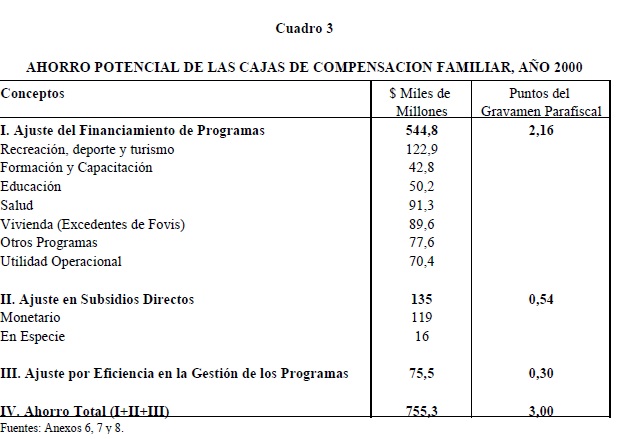 El problema del desempleo ha pasado a constituirse en el principal problema nacional del cuatrienio 2002-2006. Las empresas enfrentan sobre-cargas a la nómina equivalentes al 37.2%, después de los incrementos de la Ley 100 de 1993. En este trabajo argumentamos a favor de una reducción de 4 puntos porcentuales en los costos parafiscales, lo cual redundaría en la creación de entre 145,000 y 390,000 empleos adicionales por año. Las contribuciones parafiscales quedarían así: las Comfamiliares pasarían del 4% al 1%, donde 2 puntos constituirían un alivio tributario para las empresas que generan empleo formal y 1 punto sería redirigido a incrementar las contribuciones pensionales tanto públicas como privadas; la del SENA pasaría del 2% al 1%, dejando a las empresas decidir sobre los beneficios de destinar recursos adicionales a la capacitación laboral; y la del ICBF se reduciría del 3% al 2%, requiriéndose por parte del gobierno nacional de un gran esfuerzo por allegar presupuestalmente el equivalente a $200,000 millones (del año 2000), con el fin de continuar atendiendo las necesidades del ICBF, pero con el aliciente de derribar las barreras que obstaculizan la generación del empleo formal.