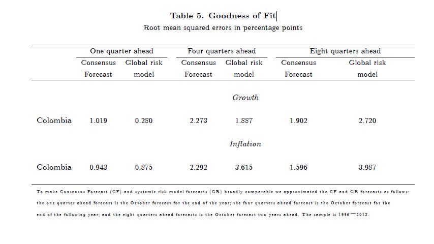 We embed a small open economy model for Colombia into the global risk model of Gómez-Pineda, Guillaume, and Tanyeri (2014). The small open economy model is estimated by Bayesian methods and used for analysis and projections. The model enable us to give a