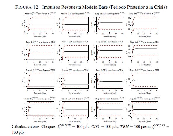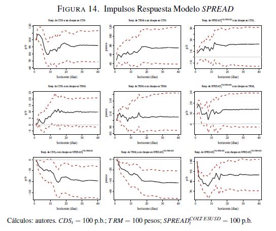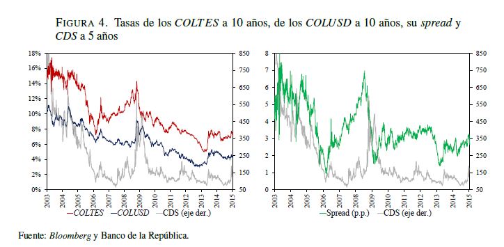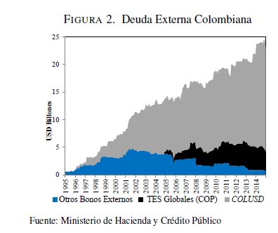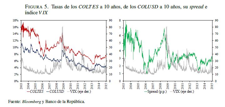 El presente documento estudia la relación de las tasas de los bonos de deuda pública del Gobierno colombiano denominados en pesos (COLTES) emitidos en el mercado local y las de aquellos denominados en dólares colocados en mercados internacionales (COLUSD), teniendo en cuenta un conjunto de variables locales y externas que afectan su comportamiento. Para ello se utilizó un modelo VARXMGARCH, utilizando datos diarios entre 06 de 2004 y diciembre de 2014. Los principales resultados muestran evidencia de que los COLUSD han sido un canal a través del cual las señales externas se han transmitido al mercado local. Para el periodo posterior a la crisis financiera internacional de 2008 se encontró evidencia de que esto ha venido cambiando de tal forma que los choques externos se han transmitido directamente en las variables locales, lo que se explica principalmente por una 05r apertura de la cuenta de capitales, la participación de los inversionistas extranjeros en el mercado local y las mejores condiciones macroeconómicas y financieras del país. Adicionalmente, dentro de los resultados se destaca que el impacto de los Treasuries (TRSY) sobre las variables del modelo estimado revela señales de dos tipos de choques: monetario y de riesgo internacional; y que hay evidencia de un 05r efecto del precio del petróleo sobre las tasas de los bonos en el periodo reciente. Palabras Claves. Deuda pública, tasas de interés locales, tasas de interés externas, choques externos, riesgo país, spreads de deuda, canal de señales.
