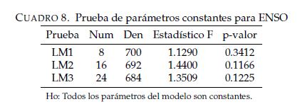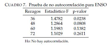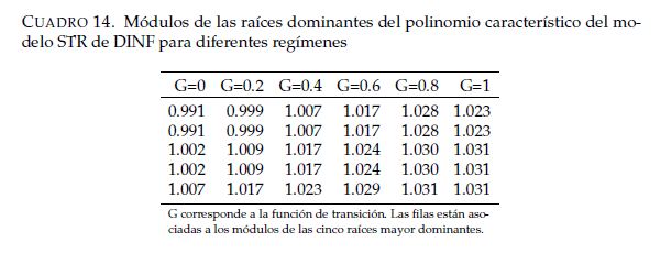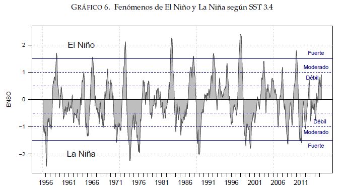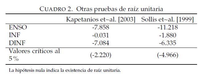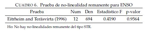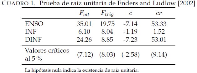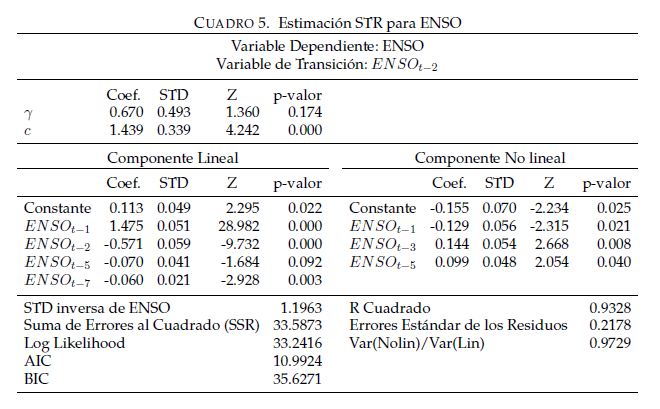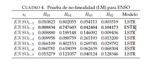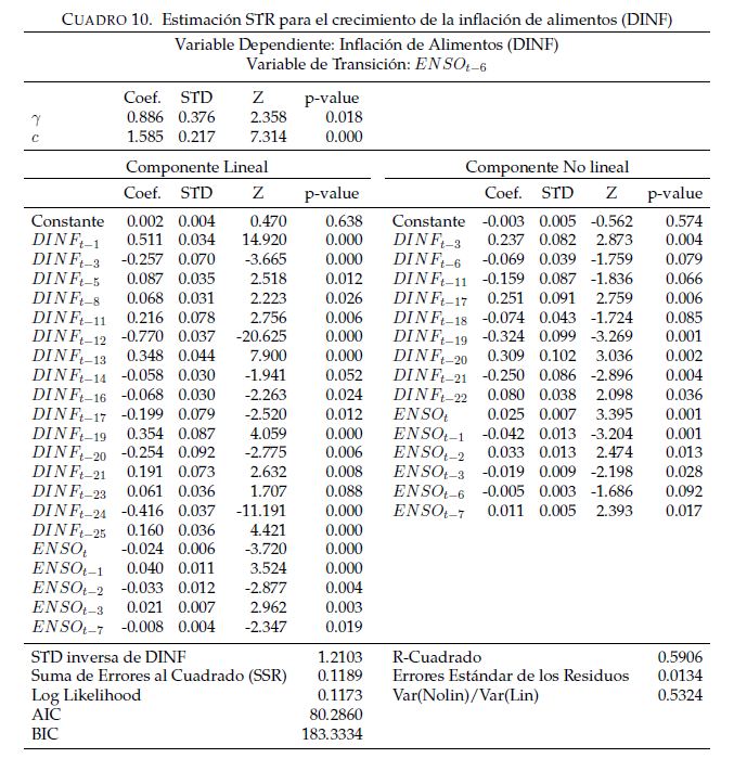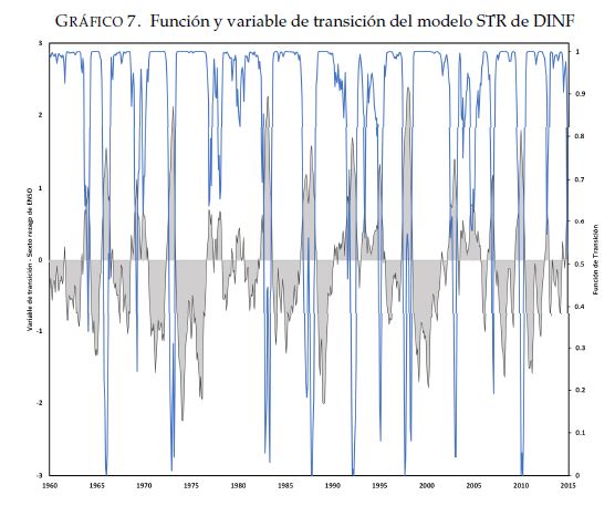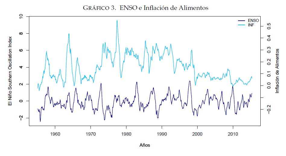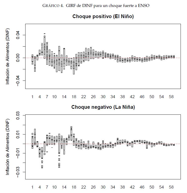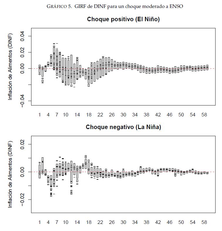 En este documento se estima el impacto de los fenómenos climáticos sobre el crecimiento de la inflación de alimentos. Para ello se utiliza funciones de impulso respuesta generalizadas de un modelo no lineal de transición suave para la inflación de alimentos y las anomalías del índice de la temperatura superficial del mar 3.4 (ENSO). Este análisis se realiza para el periodo mensual comprendido entre 06 de 1955 y 05 de 2015. Los resultados obtenidos indican que estos choques son transitorios y asimétricos. En particular, un choque positivo y fuerte sobre ENSO tiene un efecto significativo sobre el crecimiento de la inflación de alimentos y la incrementa en 72,5 y 100 puntos básicos en el cuarto y quinto mes después de la perturbación, respectivamente.