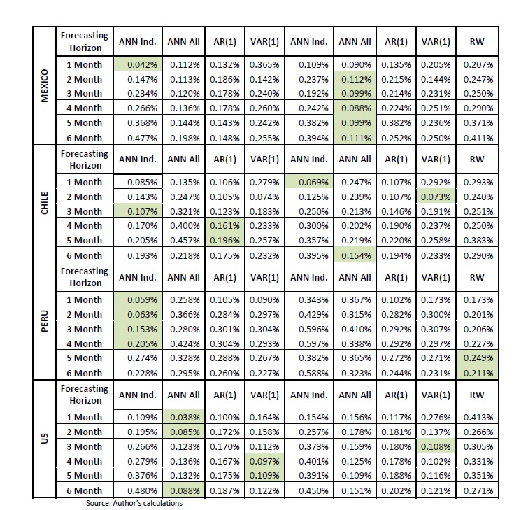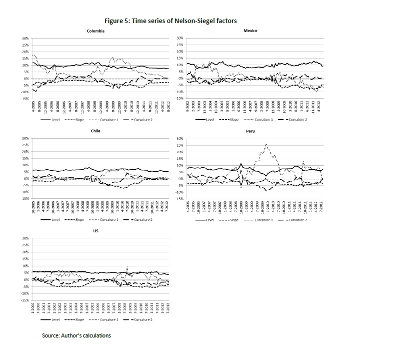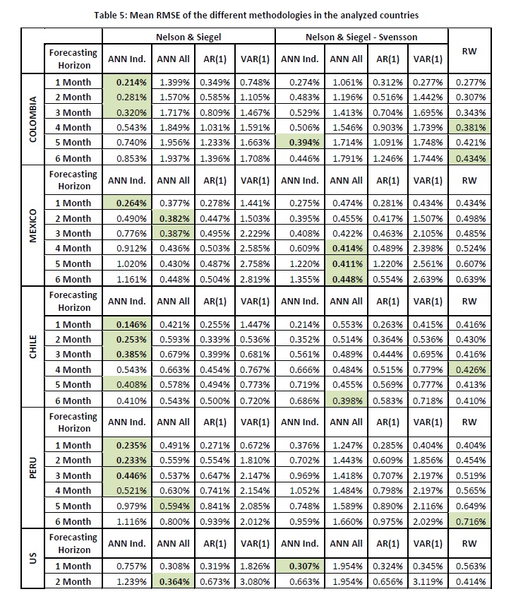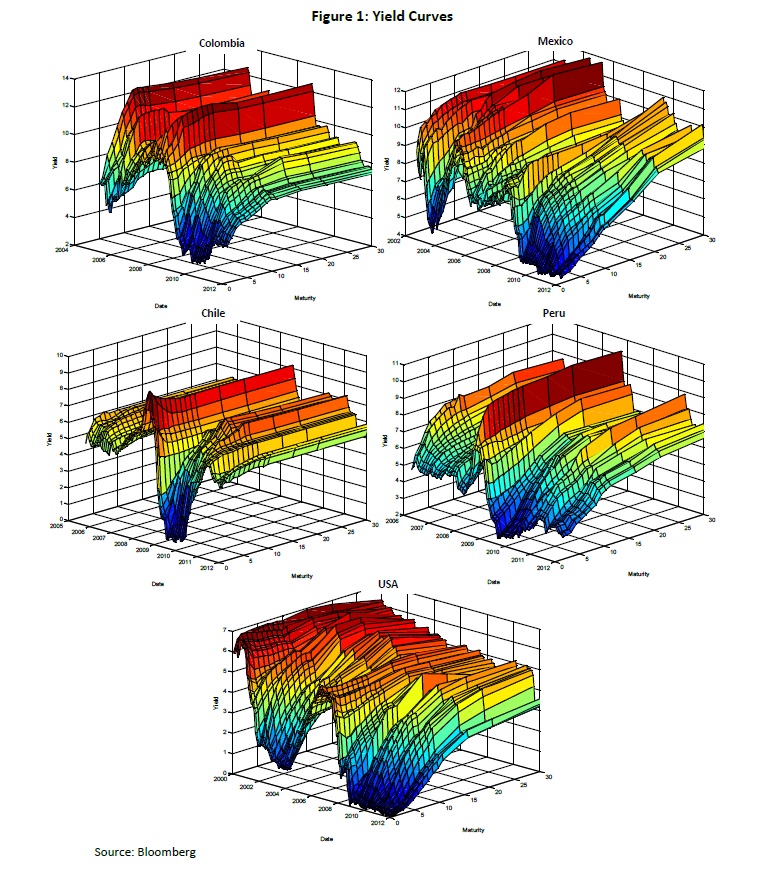 This document explores the predictive power of the yield curves in Latin America (Colombia, Mexico, Peru and Chile) taking into account the factors set by the specifications of Nelson y Siegel and Svensson. Several forecasting methodologies are contrasted