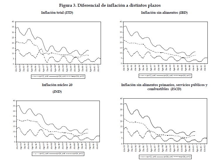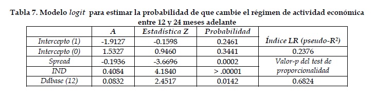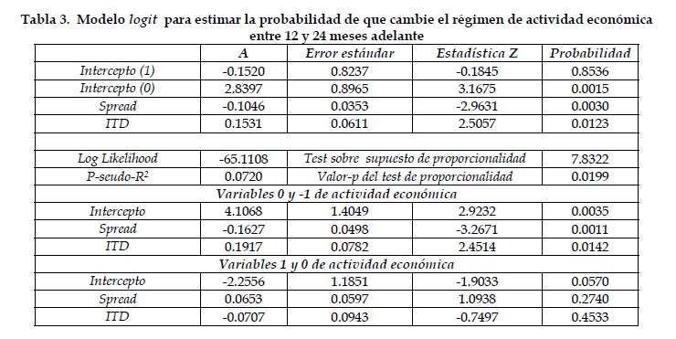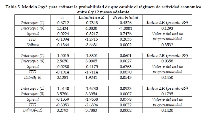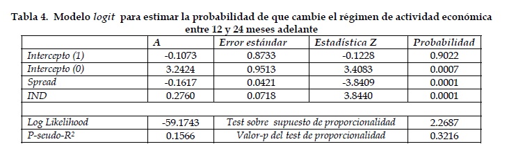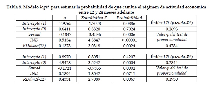En relación con los síntomas que probablemente tendrá la actividad económica en el futuro, un aumento en el spread de tasas de interés reduce la probabilidad de tener momentos difíciles mas adelante. Este resultado se cumple para un período 12 y 24 meses adelante y se ajusta al modelo teórico utilizado. La inclusión de variables monetarias en el modelo empírico no afecta la significancia estadística ni los signos del spread ni del diferencial de inflación. Sin embargo, el crecimiento monetario también contiene información sobre el ambiente económico futuro.