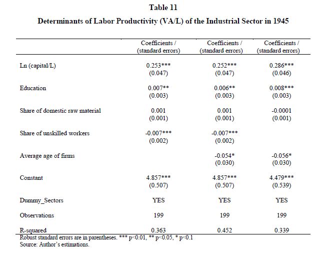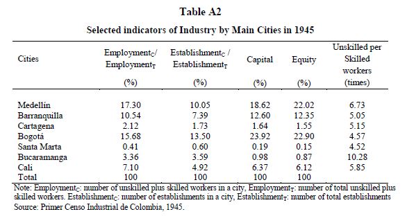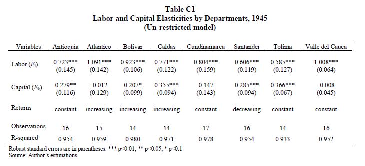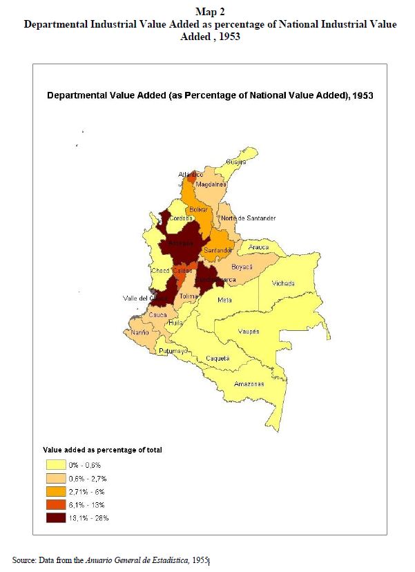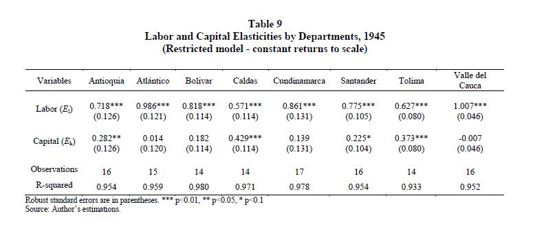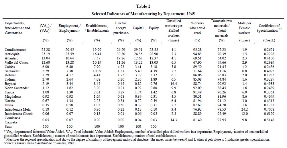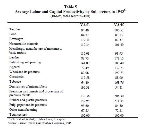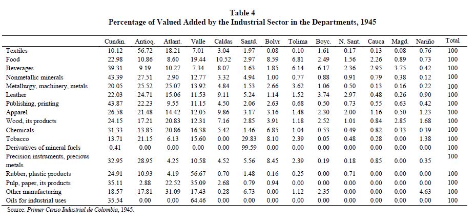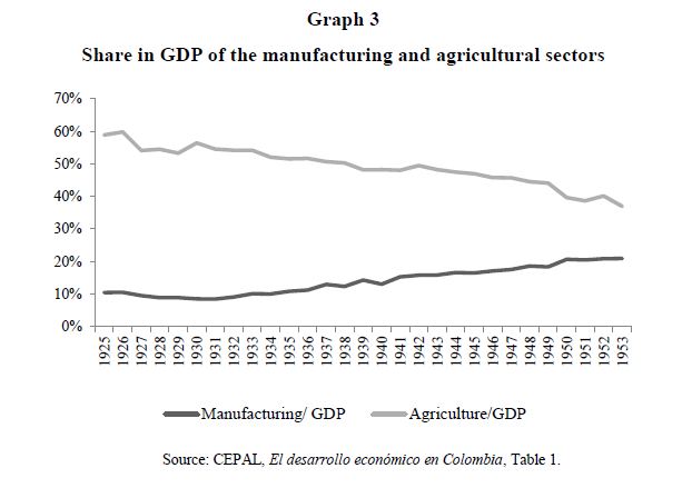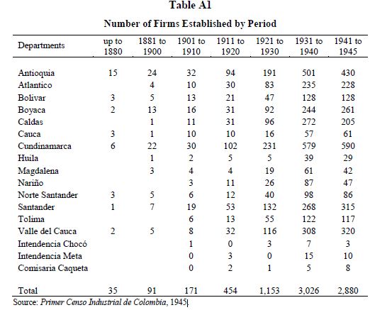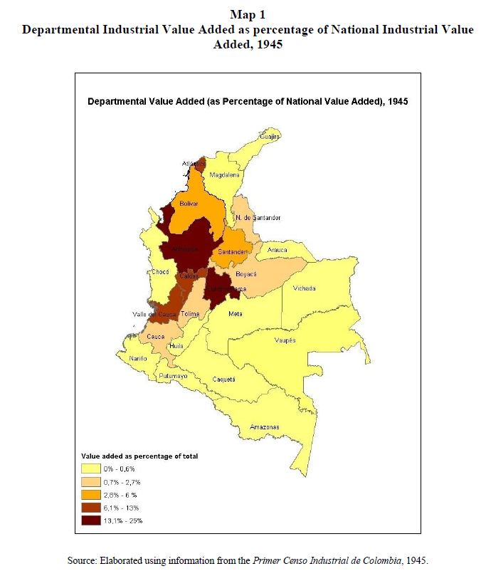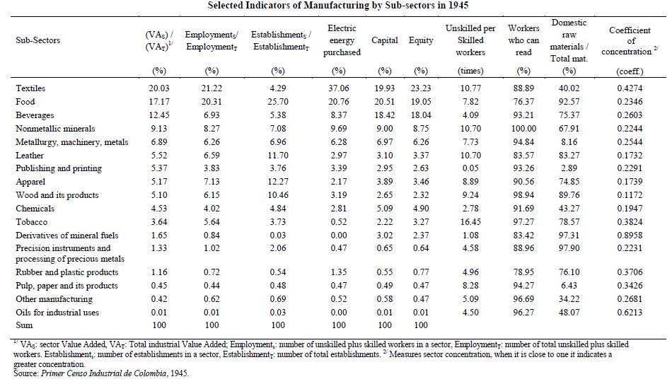 Este trabajo analiza el impacto de la Gran Depresión y del proteccionismo en el proceso de industrialización de Colombia a principios de la década de los treinta del siglo pasado, así como el impacto de otros determinantes en la rápida industrialización que tuvo lugar durante el periodo 1934-1953. Se concluye que el mercado impulsó la industrialización a través de la reducción de costos, generando economías de escala, aprendizaje mediante la experiencia, dando lugar a economías de aglomeración y a un rápido cambio tecnológico. Este trabajo también examina la estructura del sector manufacturero colombiano en 1945, que fue el resultado de las profundas transformaciones socio-económicas que tuvieron desde comienzos de la década de 1930. Los resultados indican que el proceso de industrialización fue desigual entre las regiones, y que estuvo espacialmente concentrado. Las estimaciones de una función de producción para la industria en 1945, muestran que se dieron importantes diferencias en las elasticidades factoriales y en la productividad entre sectores y regiones, lo que generó diferentes patrones de industrialización. Adicionalmente, los resultados indican que en 1945 la productividad laboral estaba positiva y significativamente relacionada con la educación y el capital, mientras que estaba relacionada negativamente con el porcentaje de trabajadores menos calificados y con la edad de las firmas.