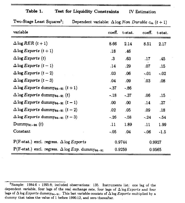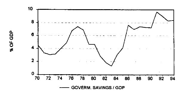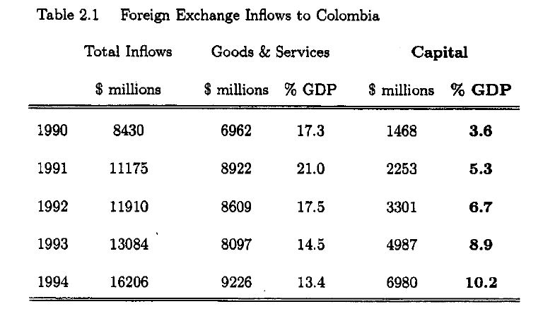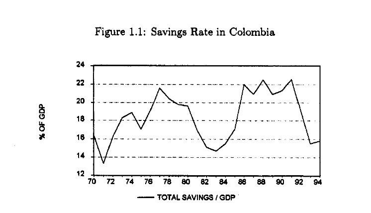 This After 1991 Colombia witnessed a sharp fall in the national savings rate (see figure 1.1), and in particular that of the private sector. Two hypotheses have been advanced for explaining this behavior. The first one stresses consumption smoothing within the Perrnanent Income Hypothesis framework (PIH). The reasons for such smoothing can be related with three major phenomena that characterized this period; namely, i. Since 1990 the government pursued an "apertura" (opening), consisting of tariff reductions, which the agents may have deemed as non-credible (transitory); hence, they exploited the advantage of purchasing imported goods at current low prices, expecting future rises in tariffs. ii. The agents believed in the apertura, but an overshooting of capital inflows led to an overvalued exchange rate, which, they expected, should be corrected at some point in the near future, with similar effects on current imports consumption. A similar effect on the real interest rate has been also claimed to have similar effects on total consumption (see Lopes et al, 1996). And iii. a predictable increase in income originated in fairly secure and substancial oil exports starting in 1997; this could lead oil exports revenues from $ 1.4 bn. yearly in 1991 (approximately 42% of total exports), to $ 4bn. after 1997. Such expected rise in income would have caused the observed increase in consumption. The second hypothesis is based on the relaxation of liquidity constraints (LCH), as a result of the capital inflows. Urrutia and Lopez (1994) argue that the increase in consumption was due to a relaxation in the liquidity constraints binding on an important share of the population (75% according to them). The inflow of capital experienced in the first years of the 1990s, and the monetary policy of that period would have allowed an increase in outstanding loans directed to consumption purposes. Cárdenas (1996) and Sánchez (1996) also present evidence in support of this hypoth.