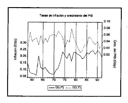 Los casi 40 años corridos desde 1958 han sido testigos de variaciones intensas de la inflación, aunque más al principio que al final. En efecto, entre 1958 y 1974 se observan inflaciones con un nivel medio más alto: 22% anual, con una desviación estándar de 2.3%. También han sido años de oscilaciones de la tasa de crecimiento del PIB real fue 1.7% entre 1958 y 1992, lo cual equivale a 38% de inestabilidad si se la compara con la tasa media de crecimiento, que fue 4.5% anual entre 1958 y 1992.